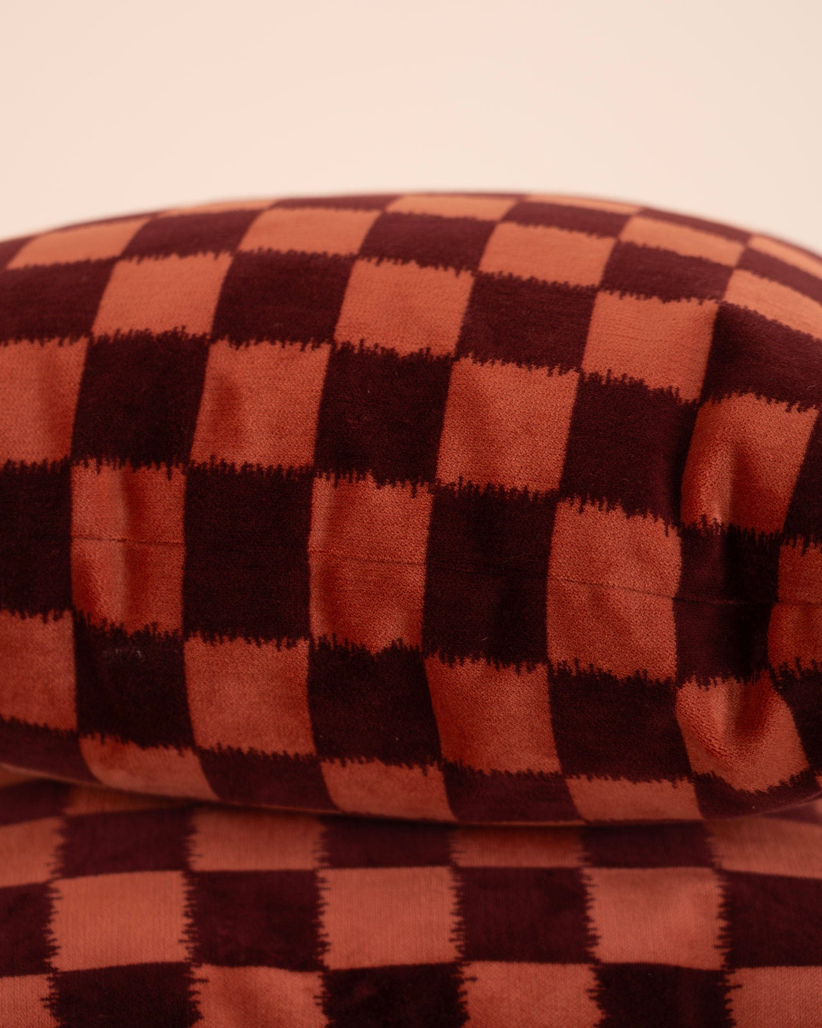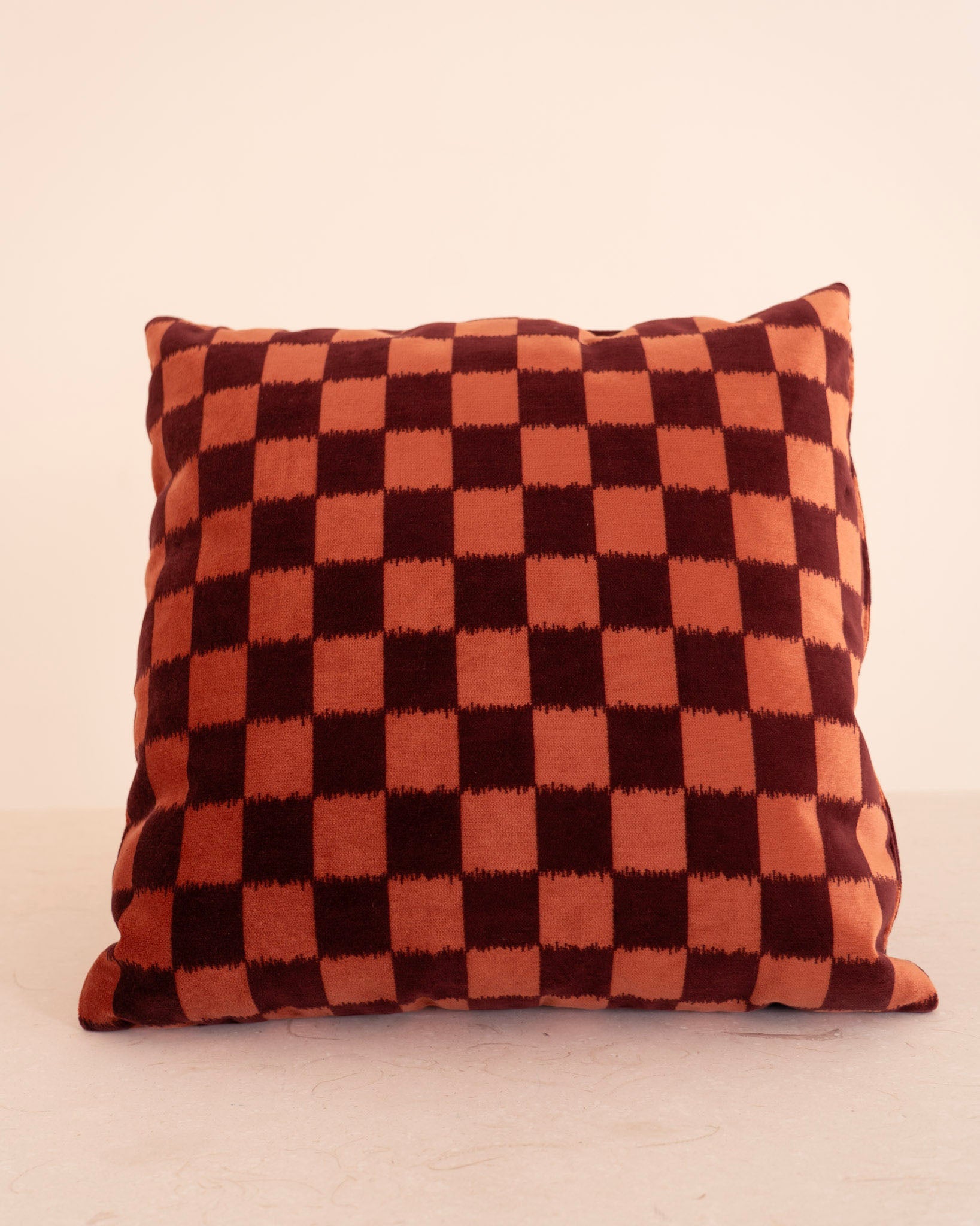 Almohadón cuadrado con tela de cuadros en tonos rosa y burdeos.