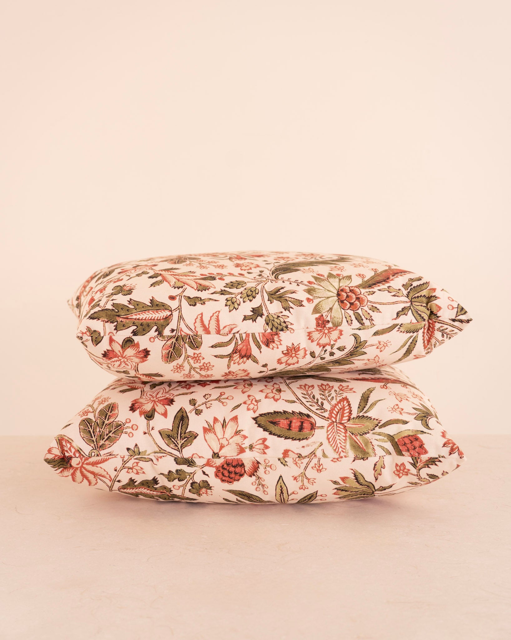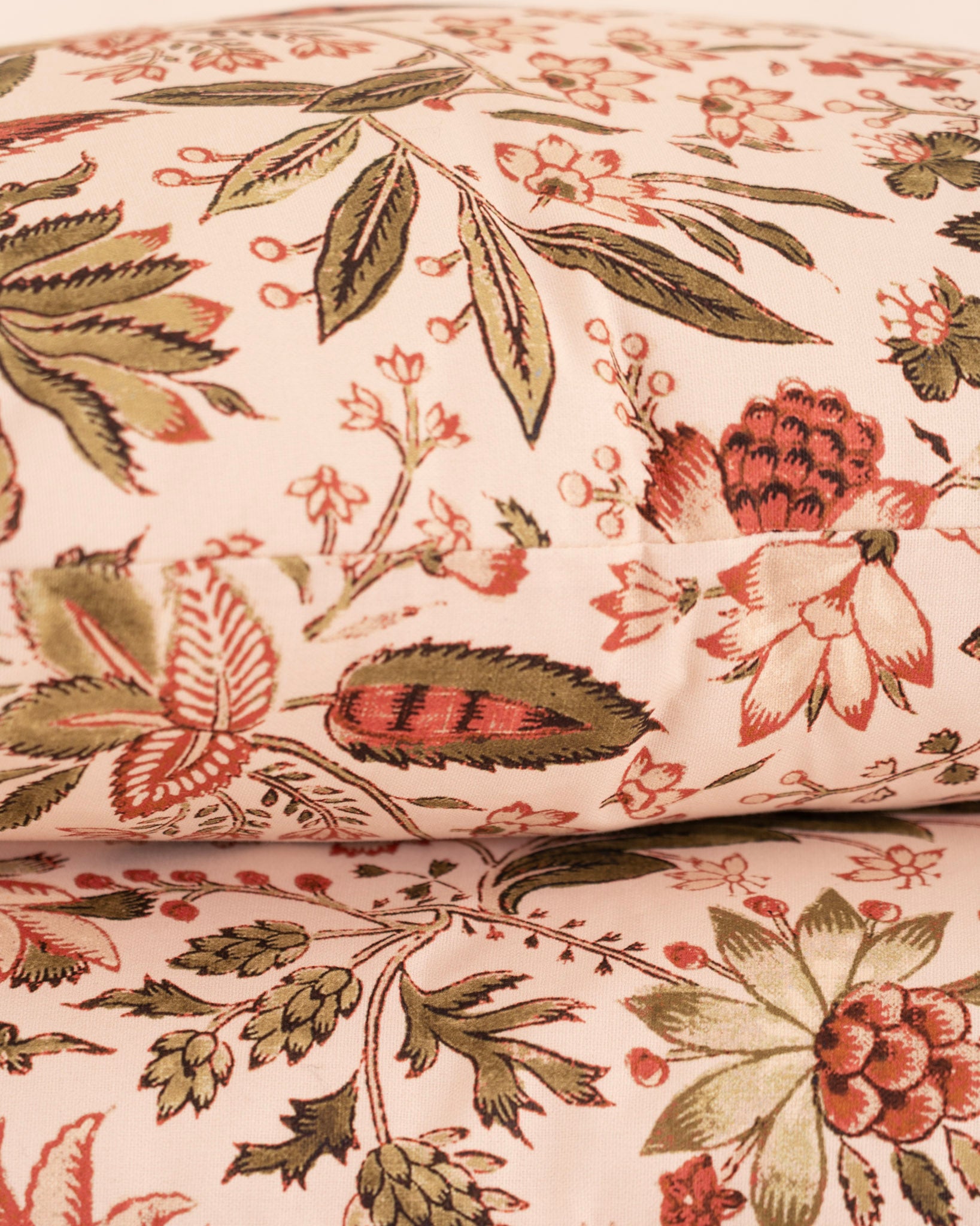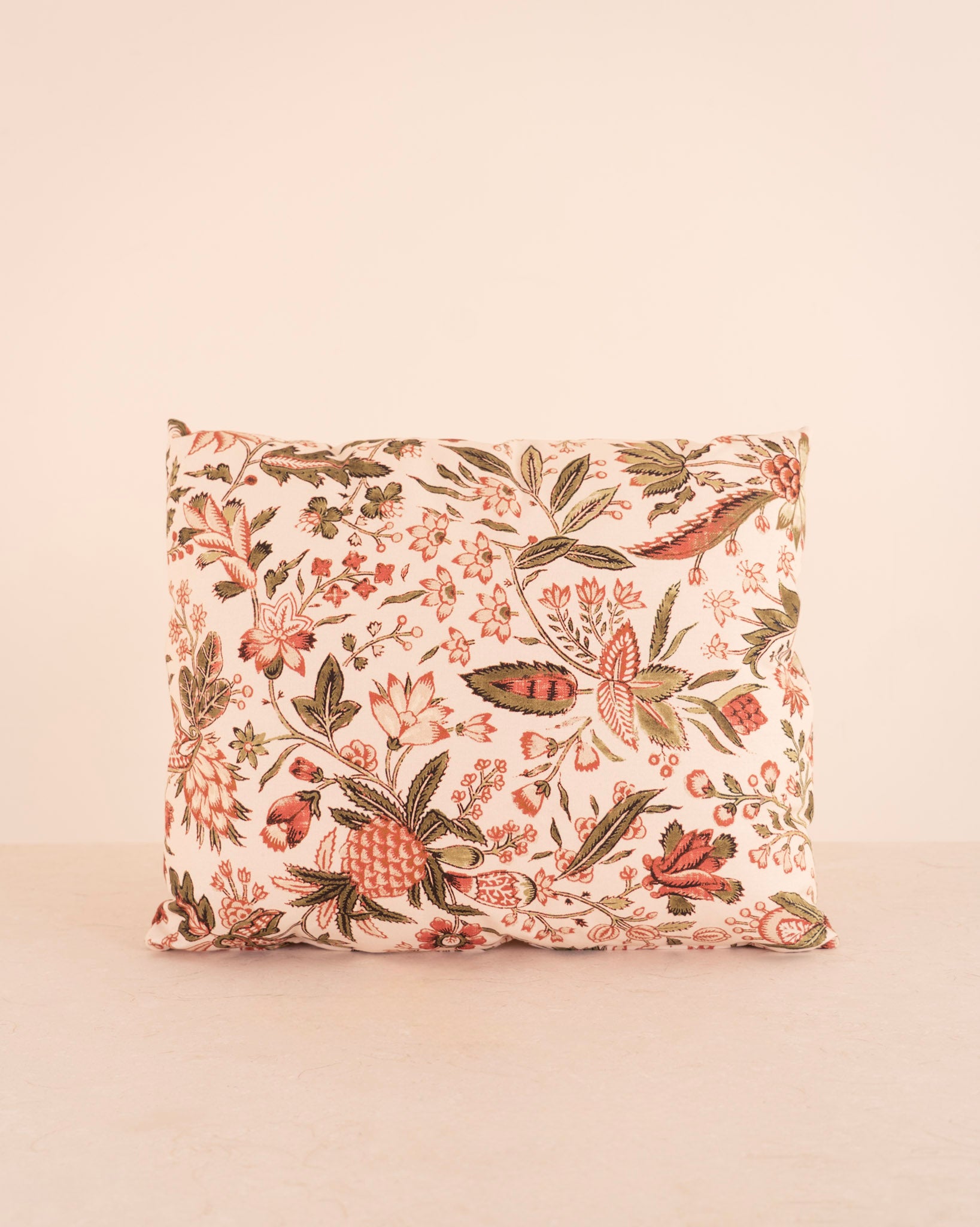 Almohadón rectangular en tela de flores en tonos cálidos.