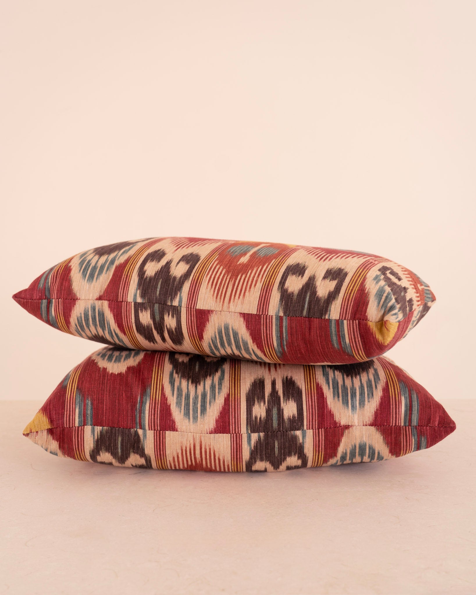 Almohadón rectangular de tela estampada de estilo étnico en tonos verdes, blanco. frambuesa y morado.