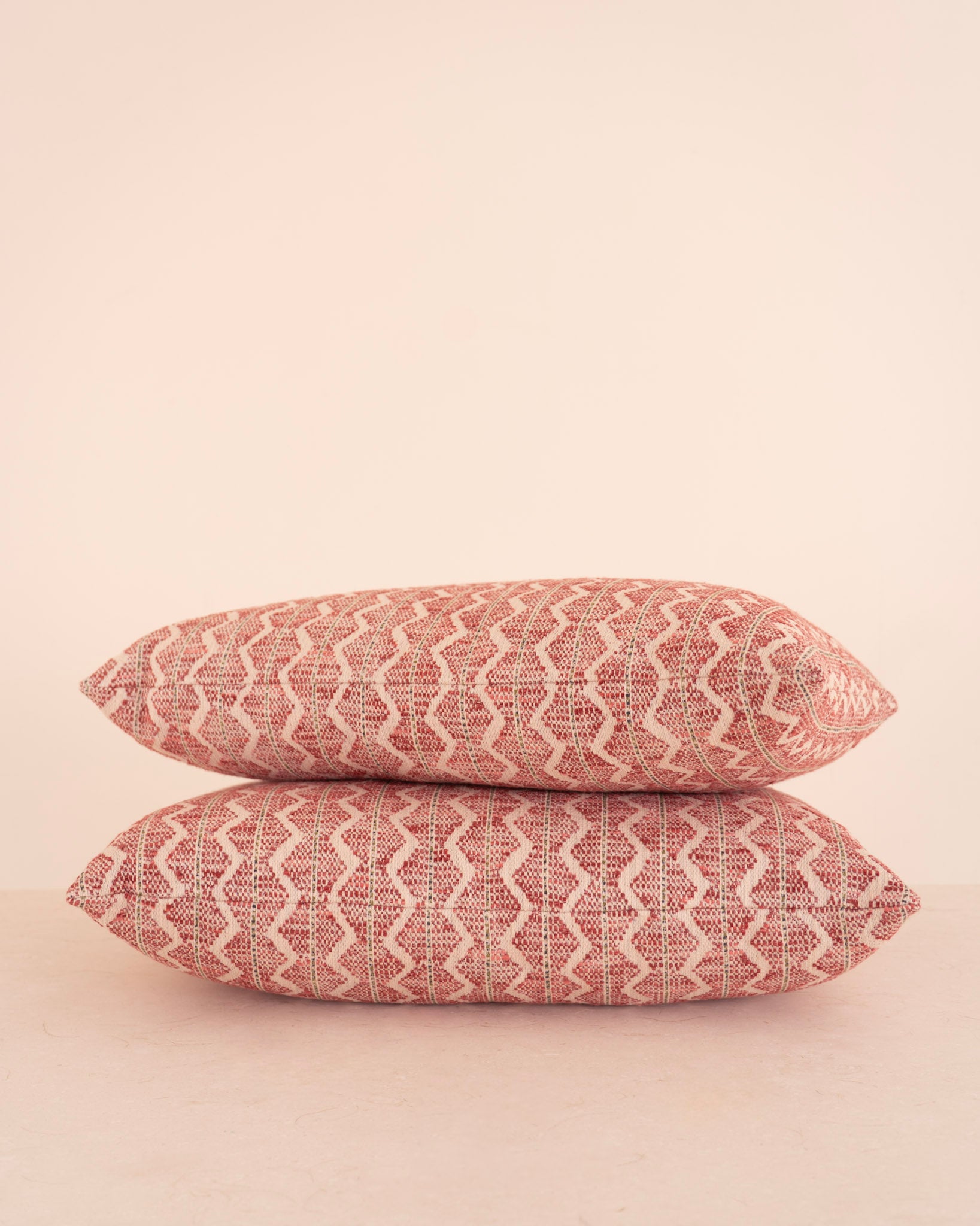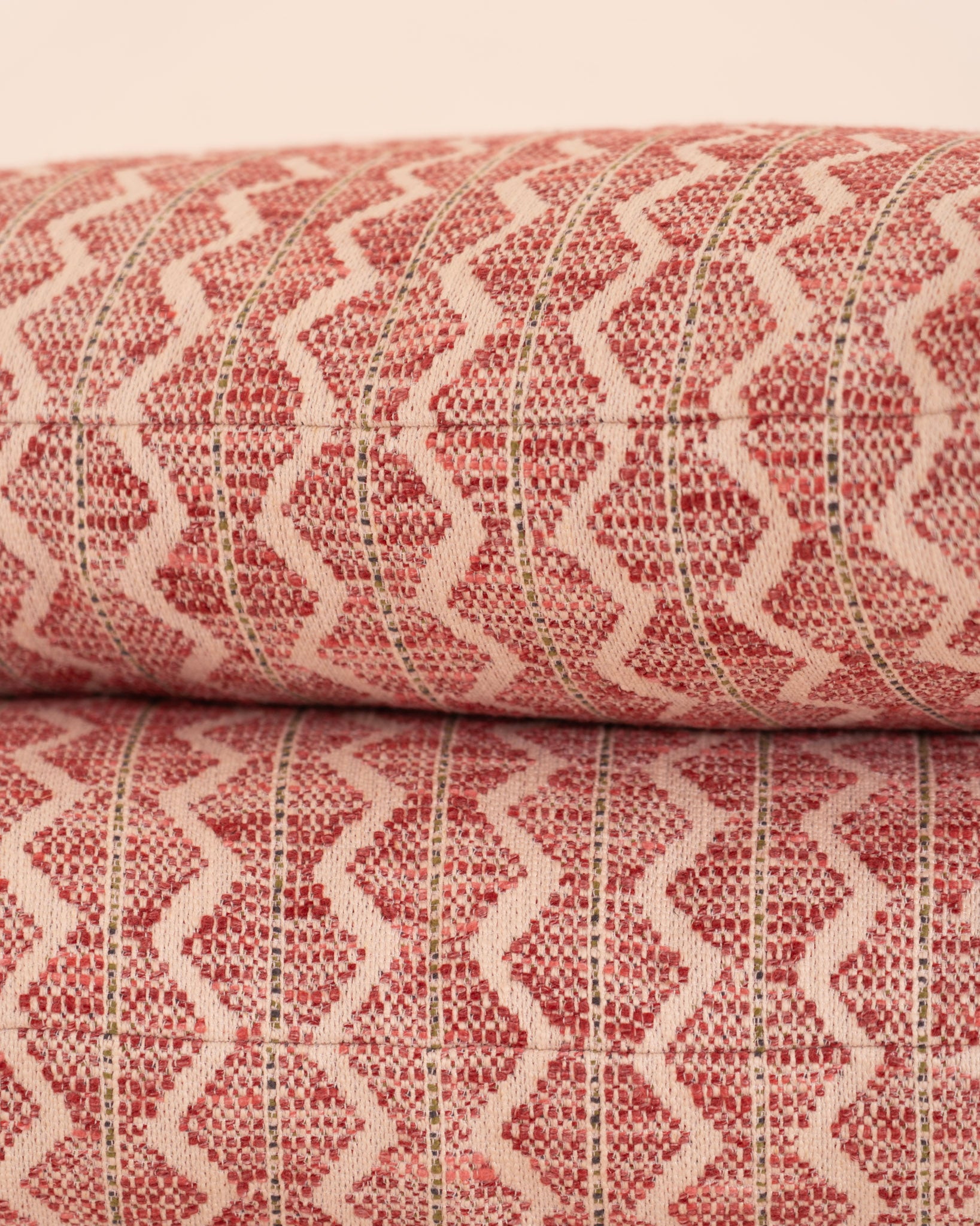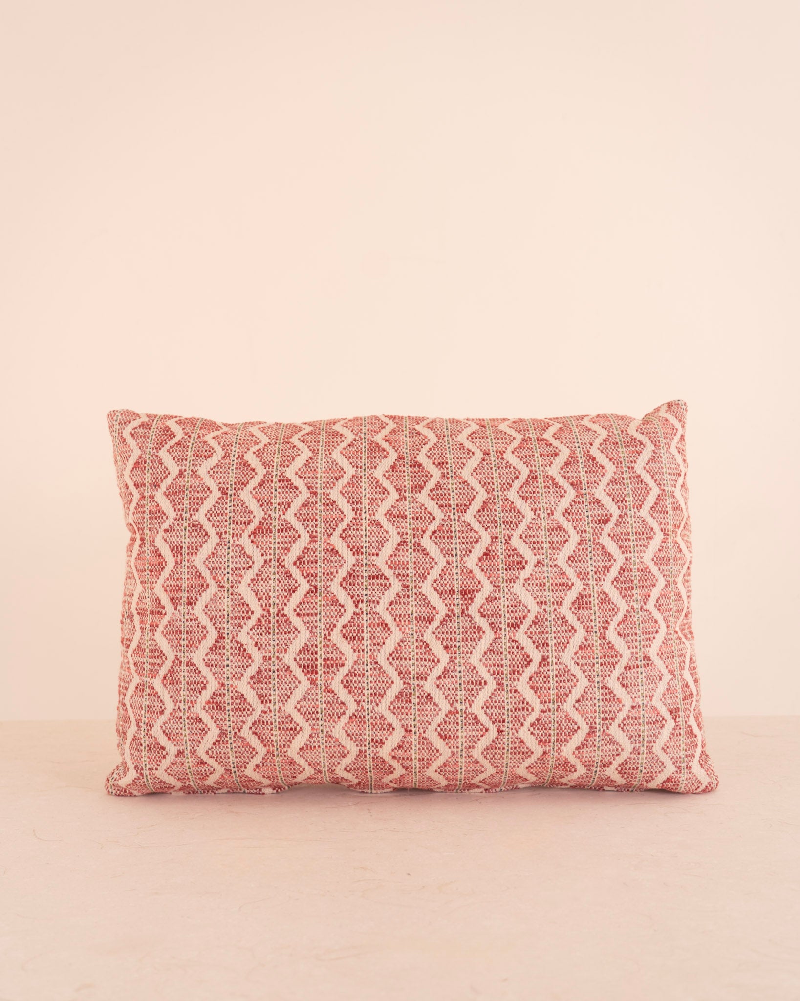 Almohadón rectangular con tela en diseño zigzag en color frambuesa, beige y verde.