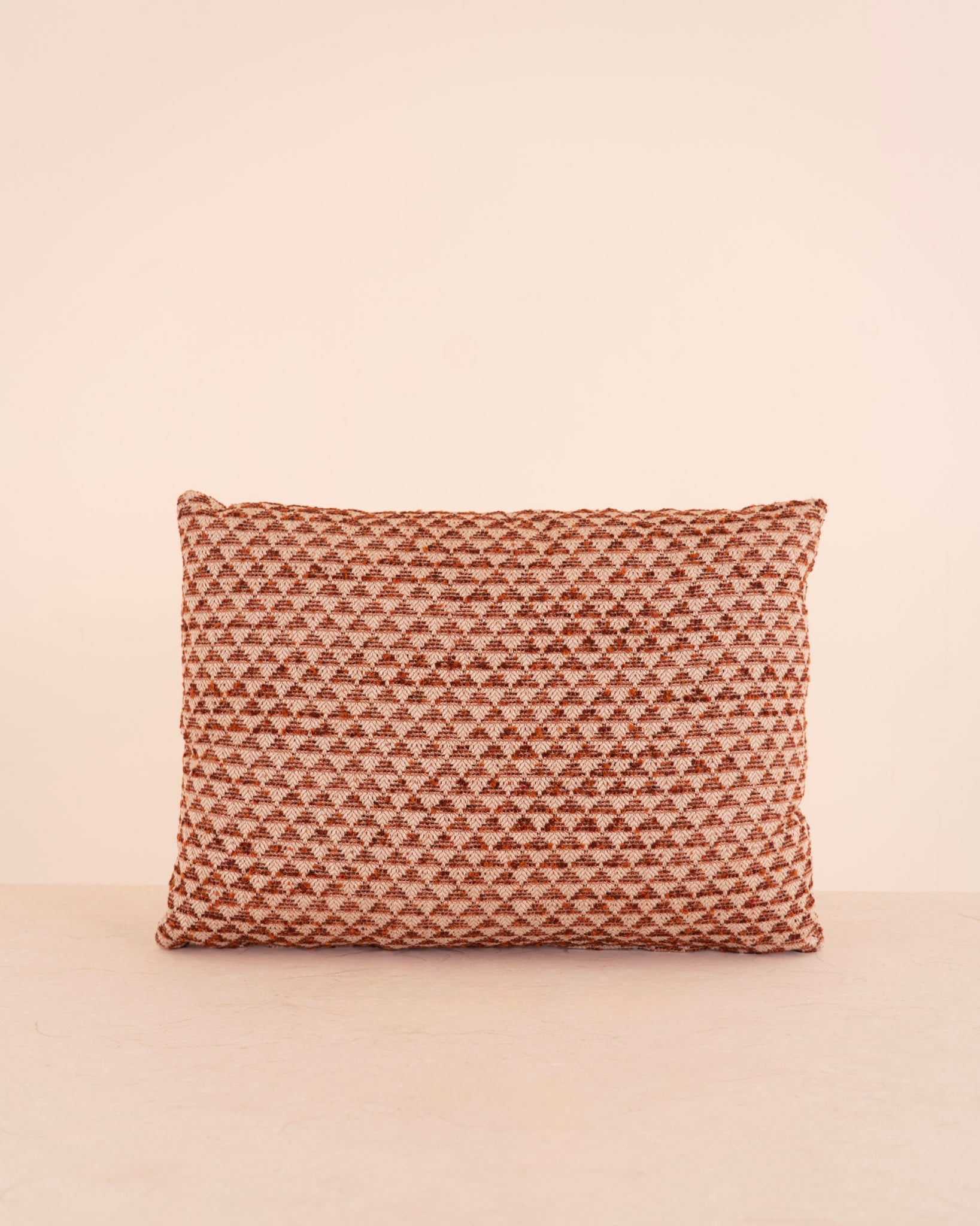 Almohadón rectangular con tela con dibujos de triángulos en naranja y beige.