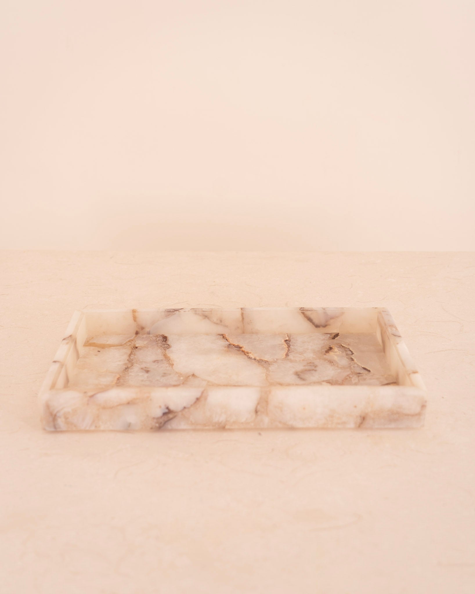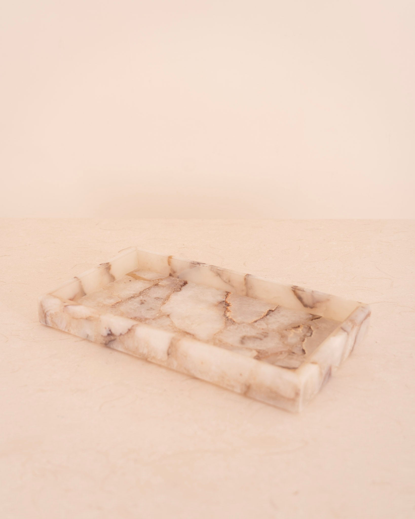 Bandeja vacía bolsillo fabricada en piedra en tonos beige y blanco.