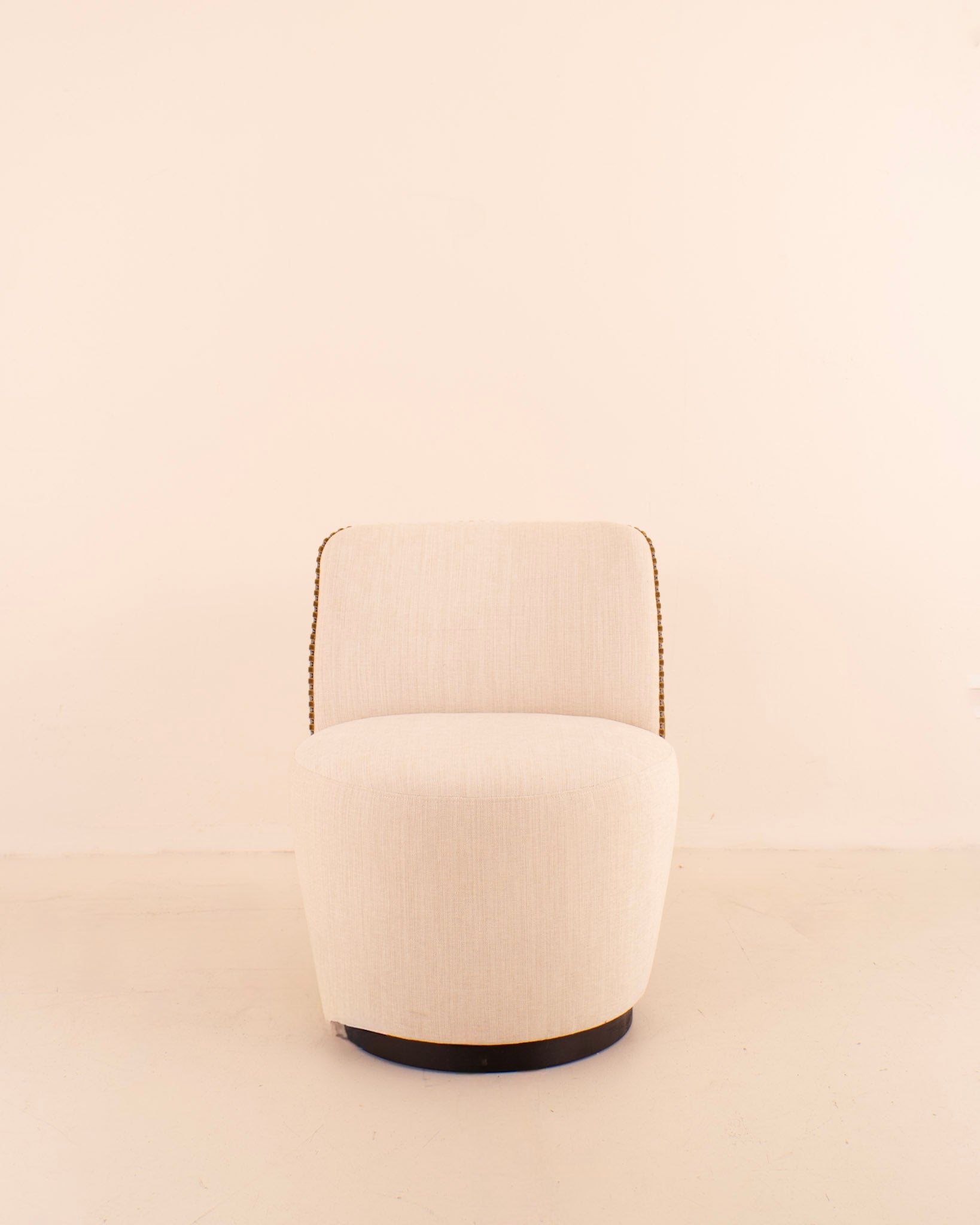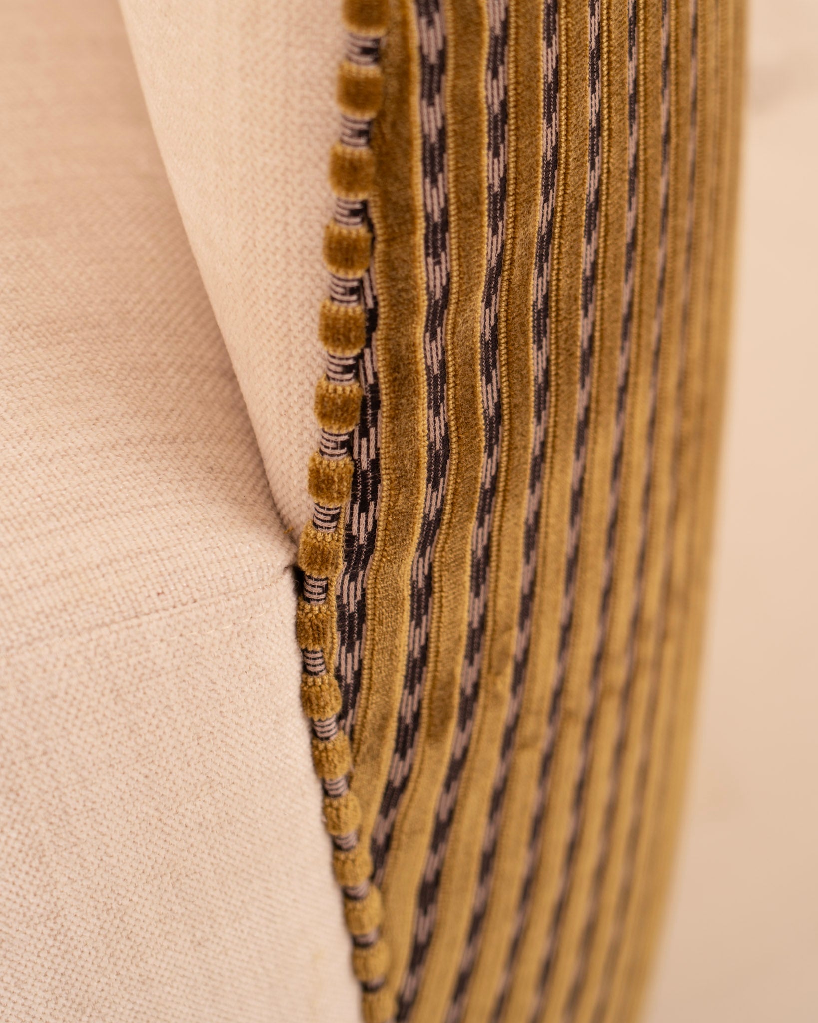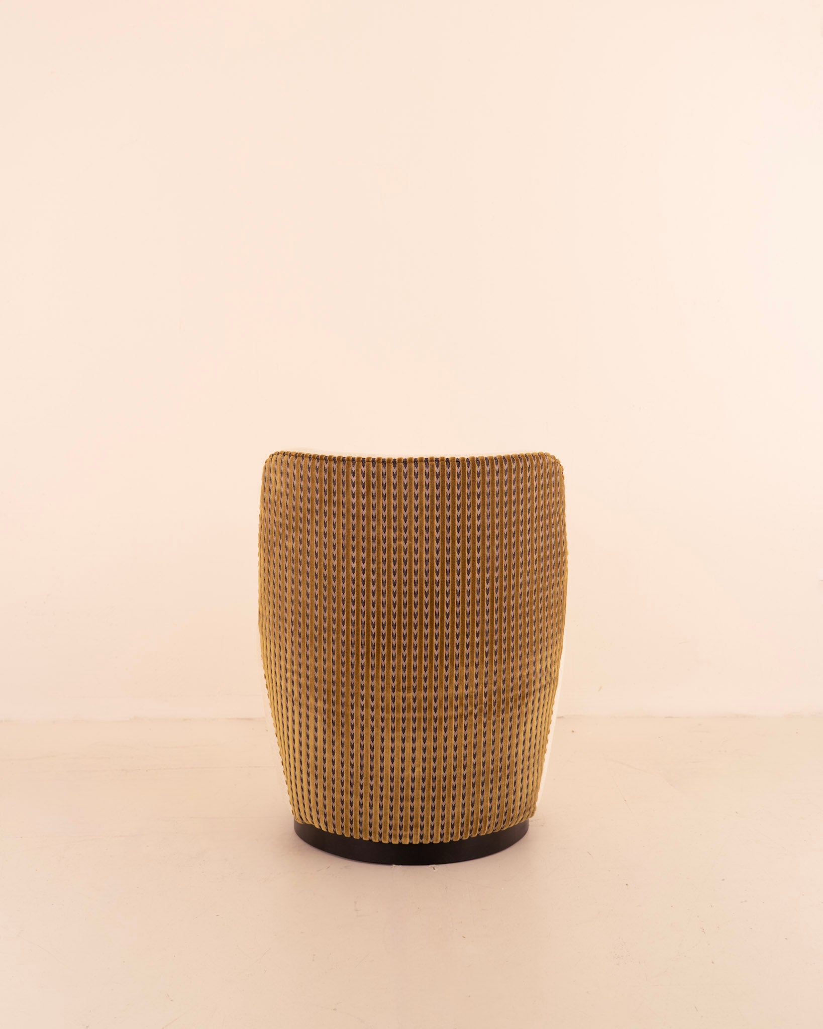 Sillón de diseño curvo y tapizado en tela beige en el asiento y estampado de estilo retro en verde, beige y negro.