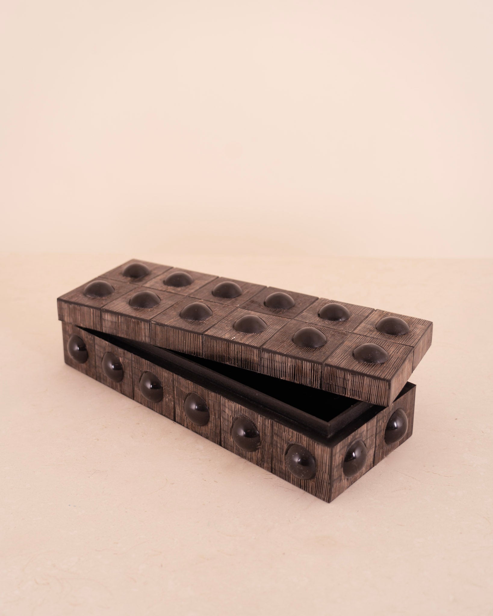 Caja para almacenaje fabricada en madera con detalles semicirculares y acabado en tonos gris oscuro envejecido y negro.