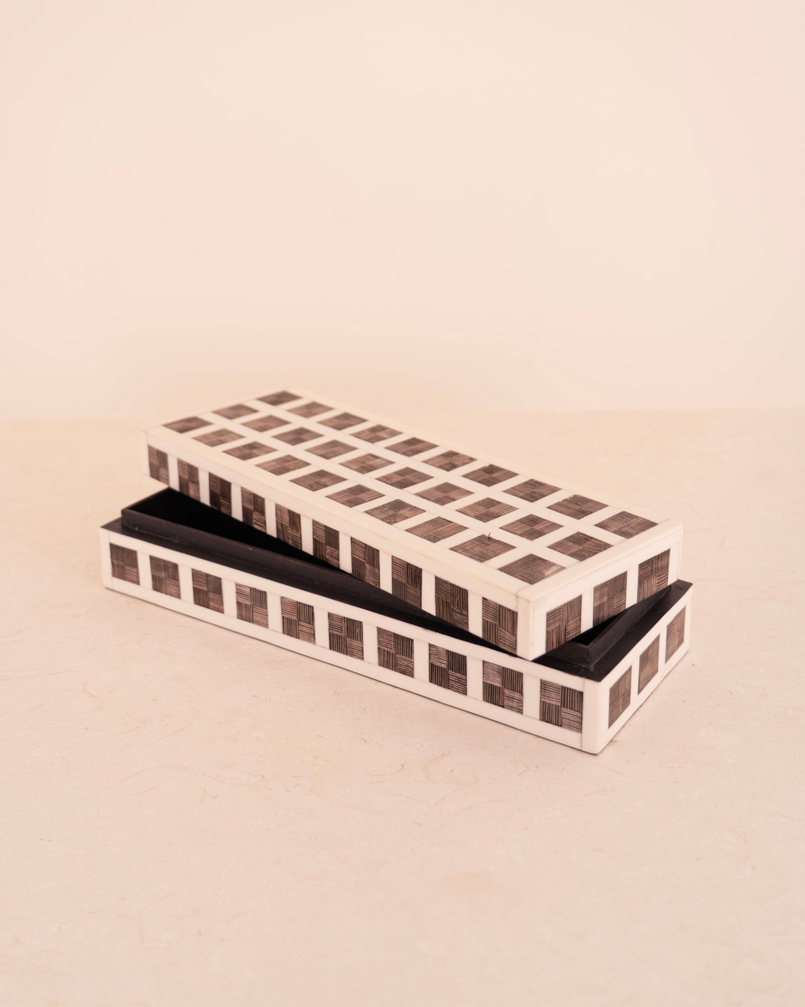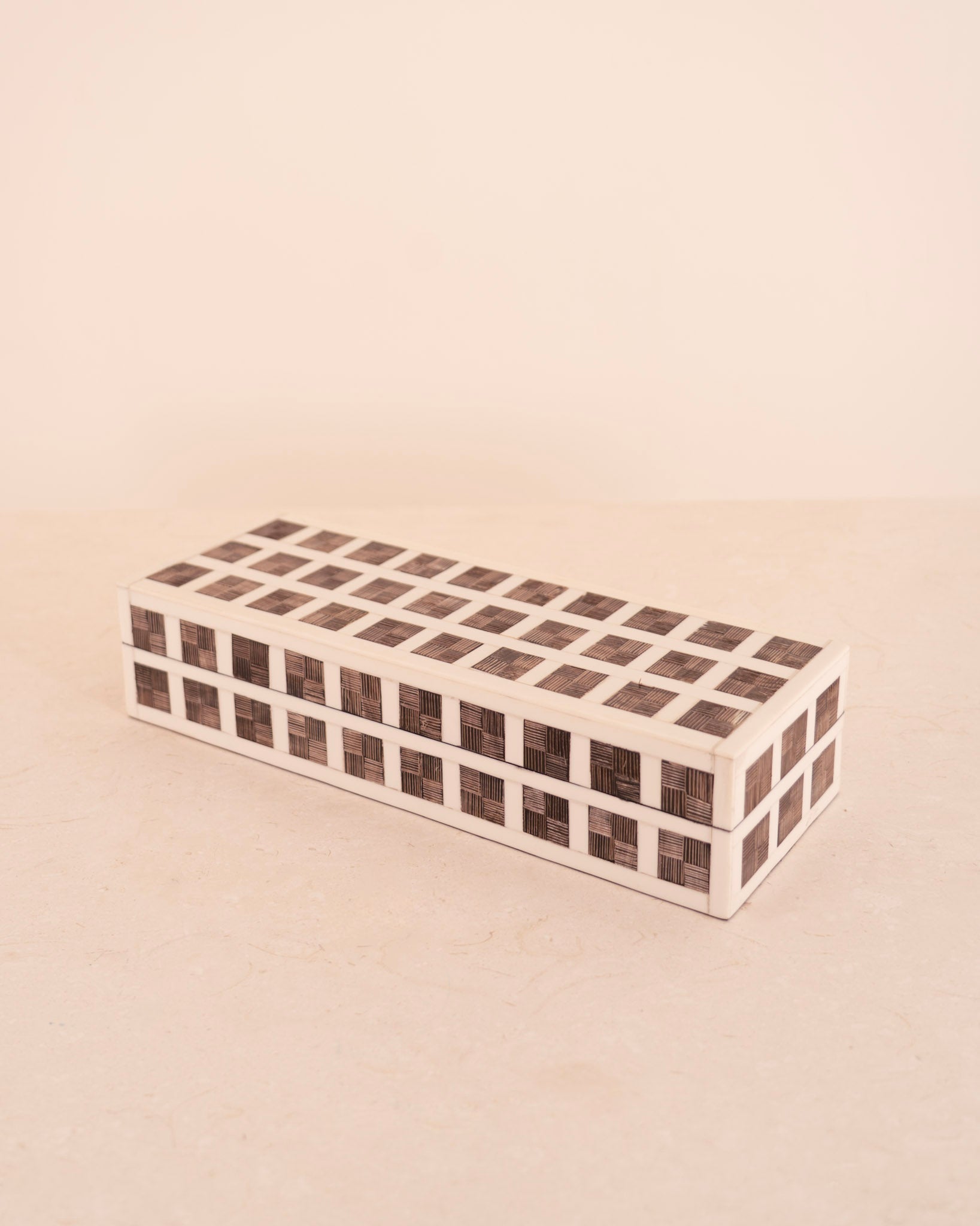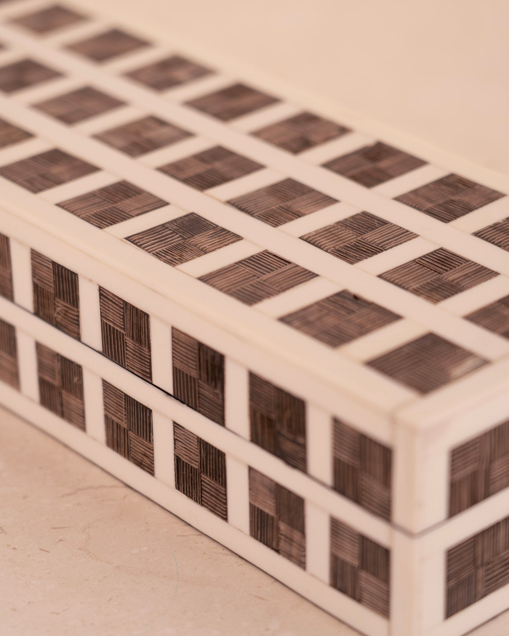 Caja fabricada en madera con dibujos de cuadros en marrón envejecido sobre fondo blanco roto.