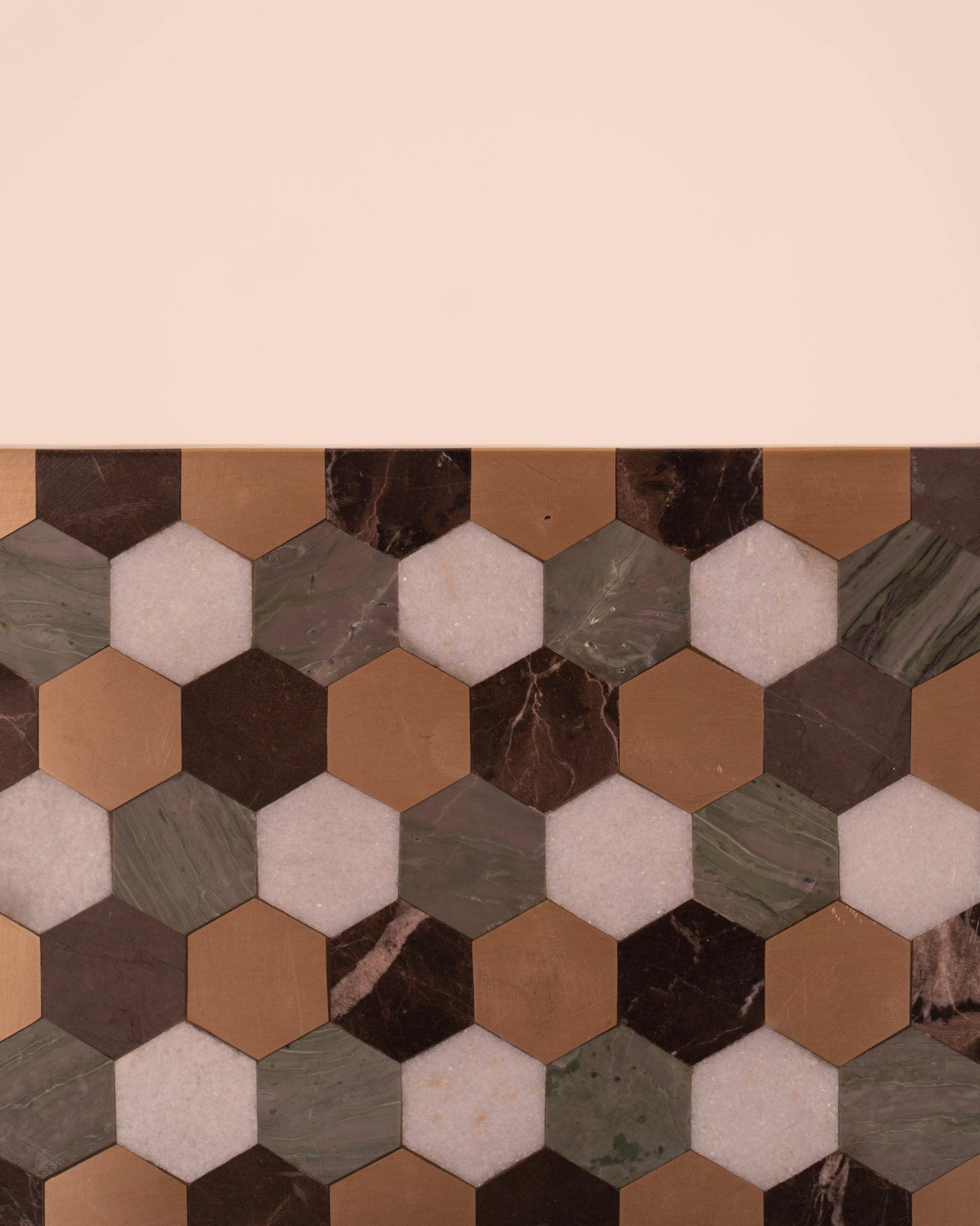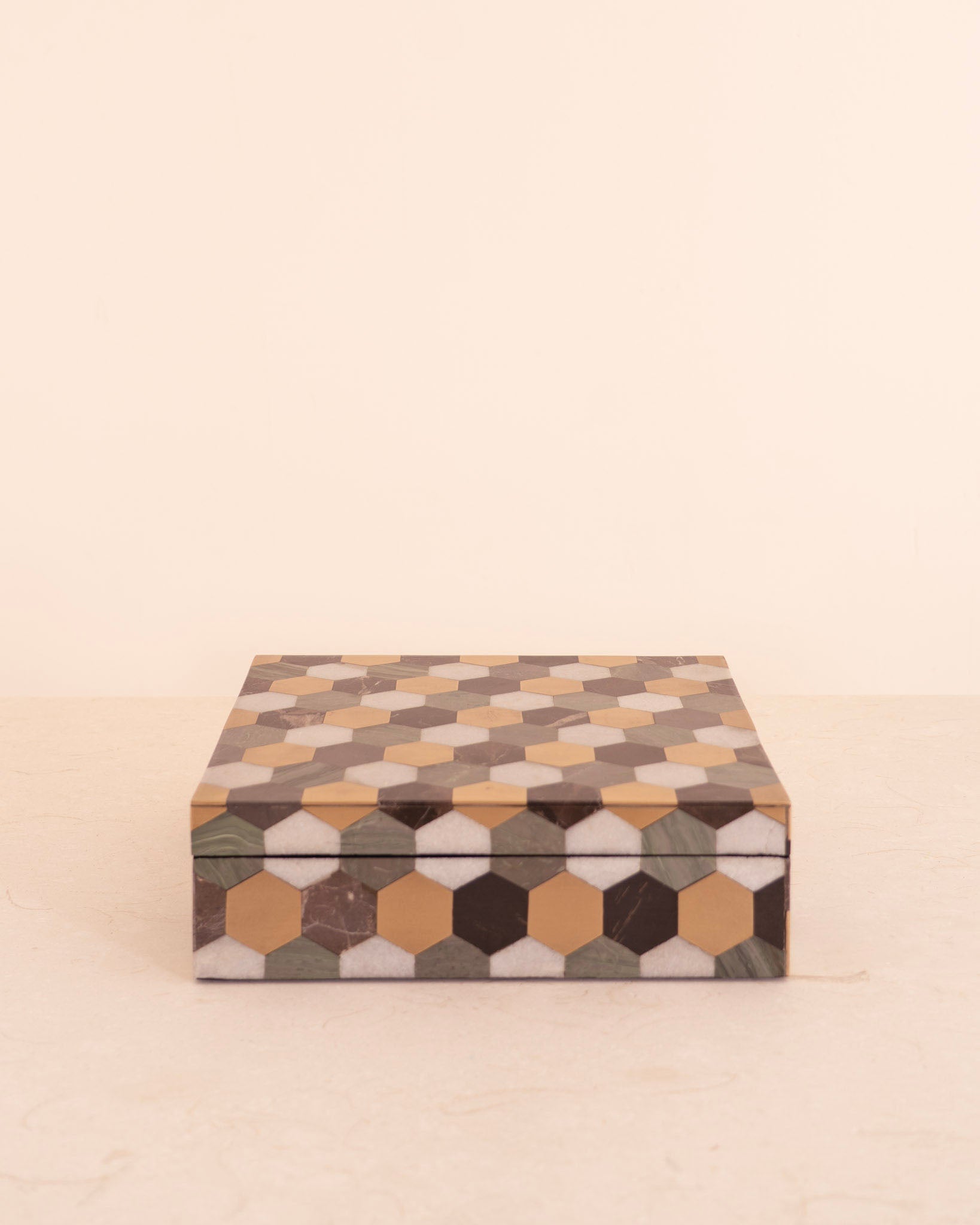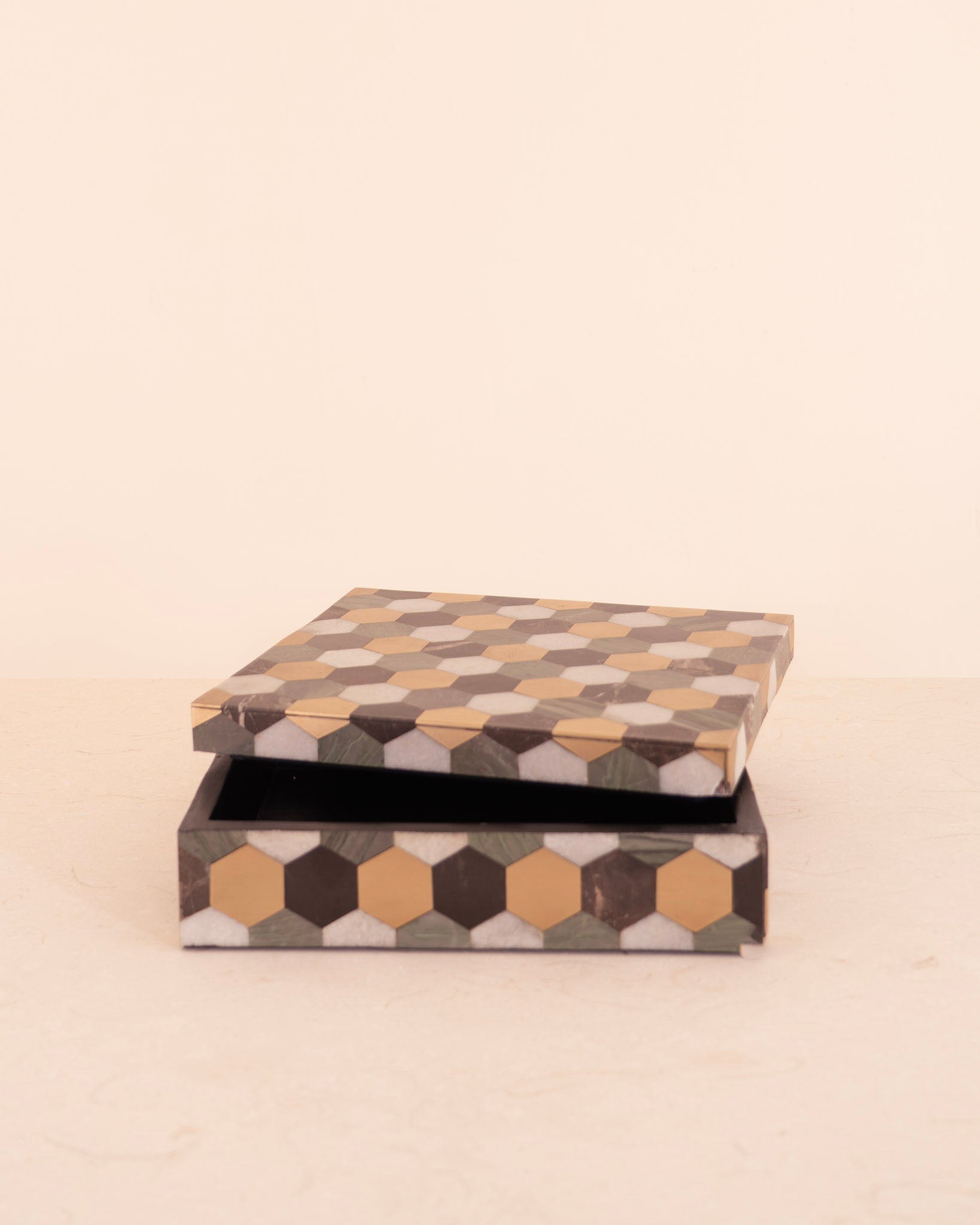 Preciosa caja con dibujos geométricos en tonos verde, blanco, negro y dorado.