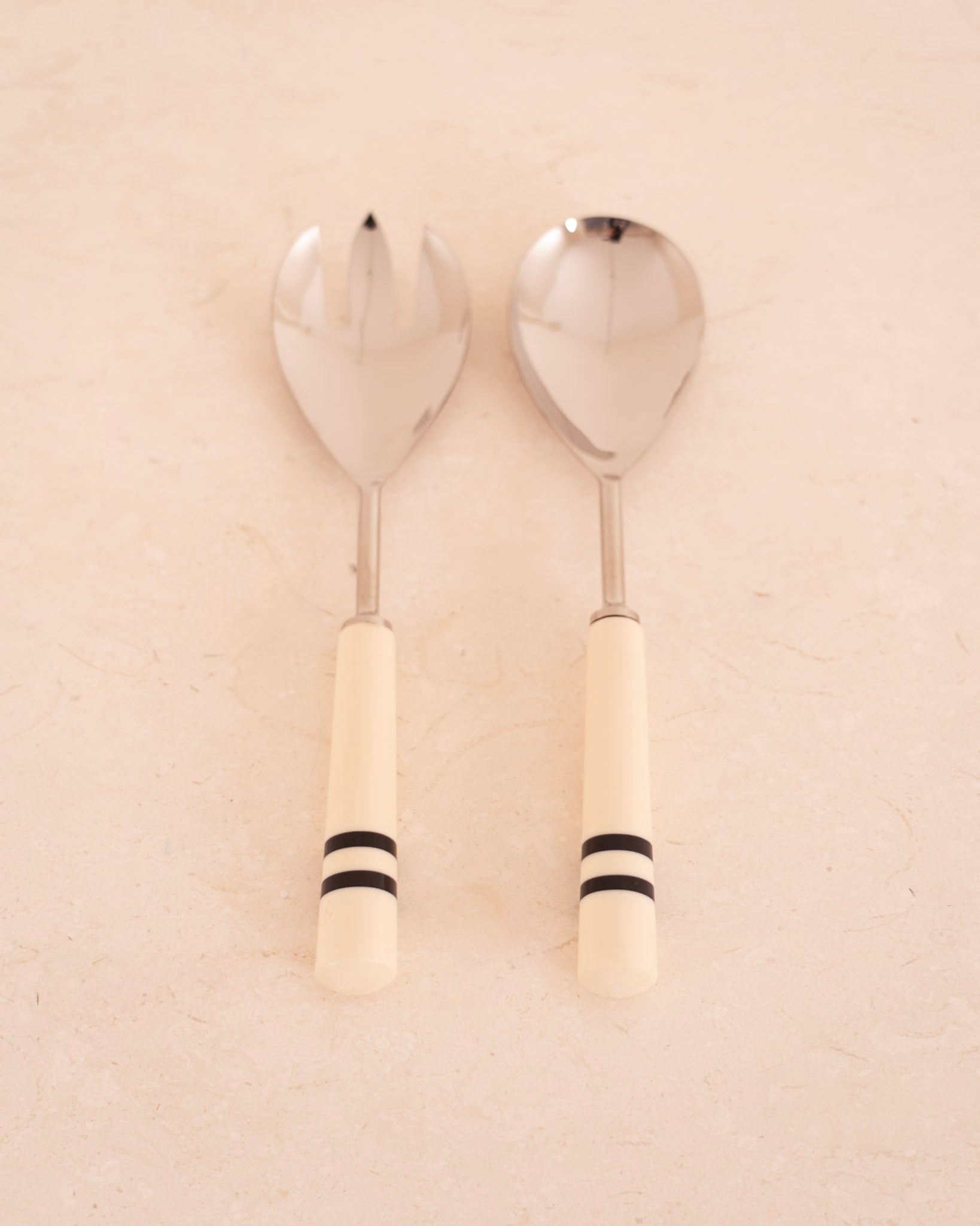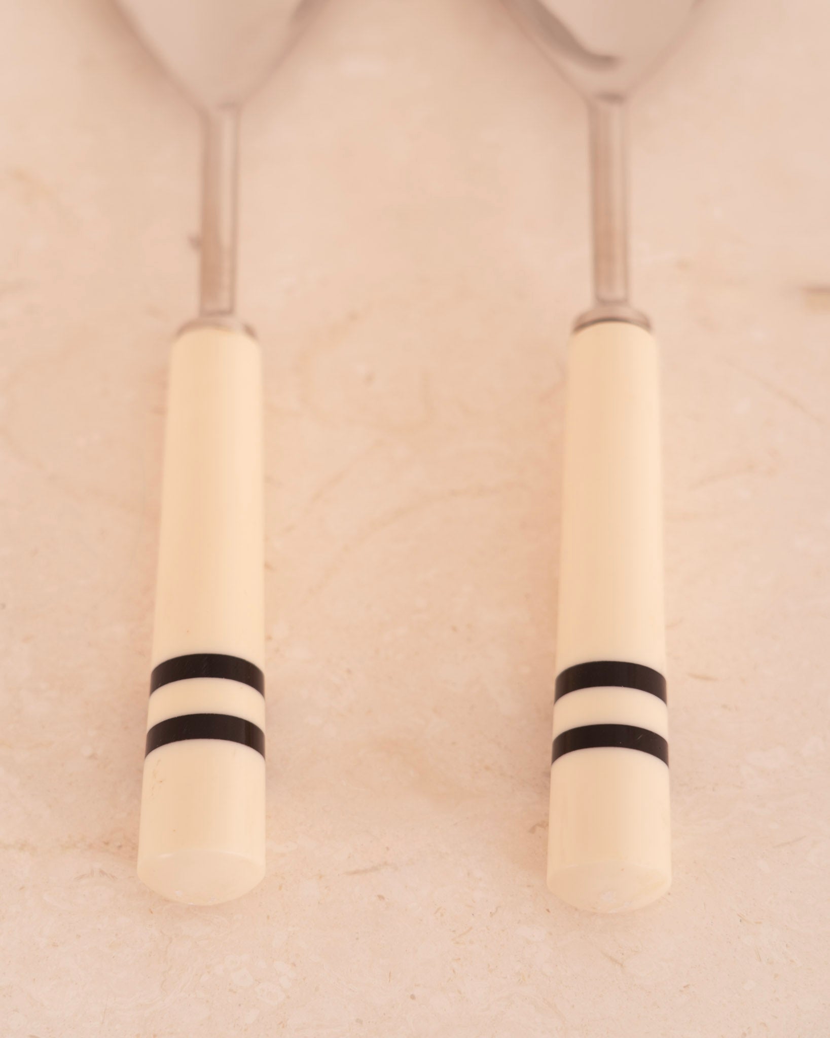 Cubiertos de servir con mango fabricado en madera acabada en blanco y negro.