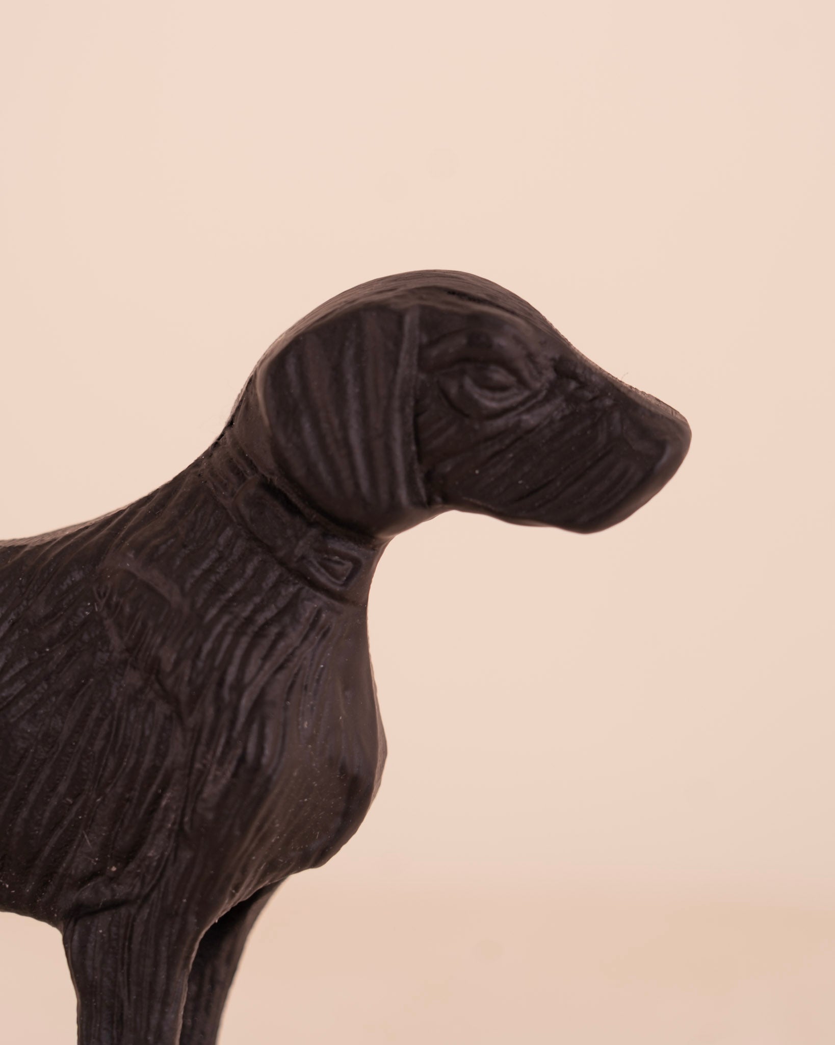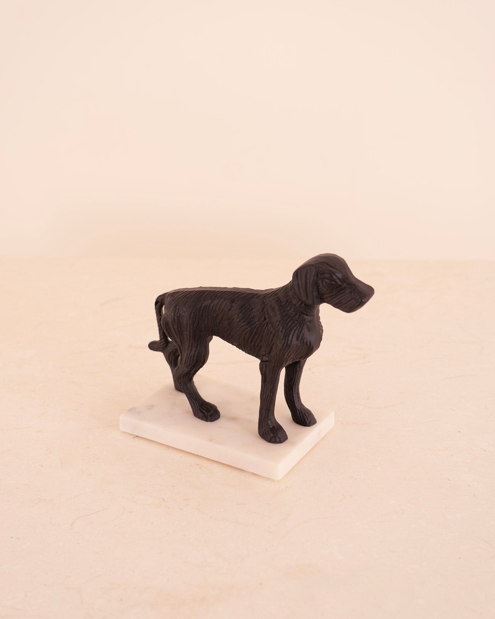 Escultura de perro fabricado en hierro negro sobre peana cuadrada en mármol blanco.