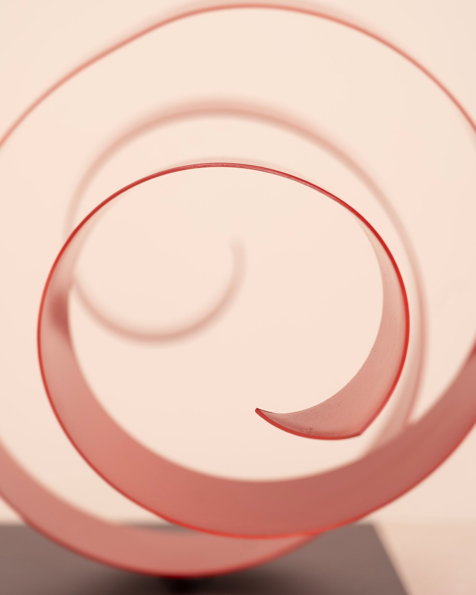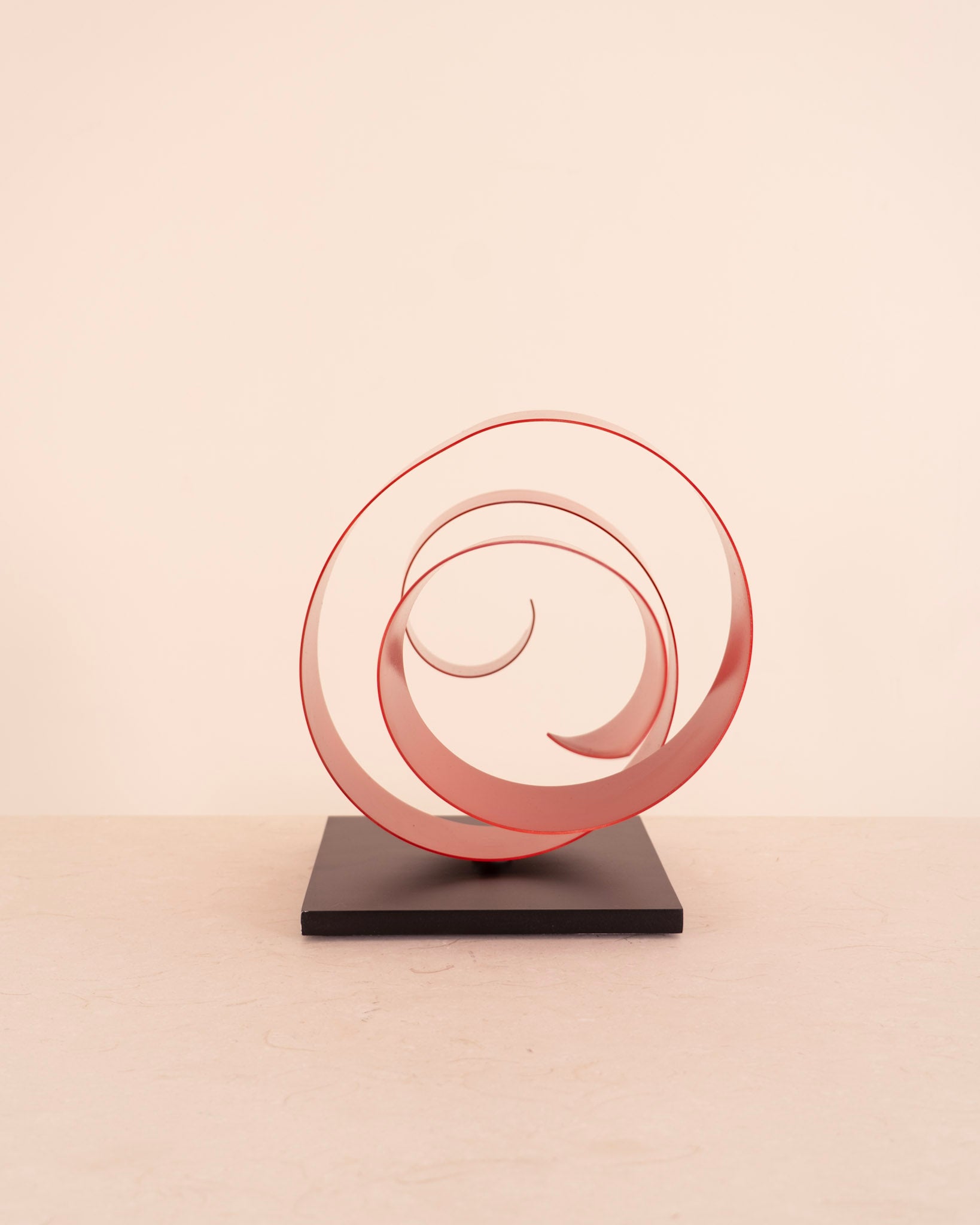 Preciosa escultura fabricada de forma completamente artesanal. Hecha con peana en madera en color negro y escultura en hierro con forma espiral en color rojo.