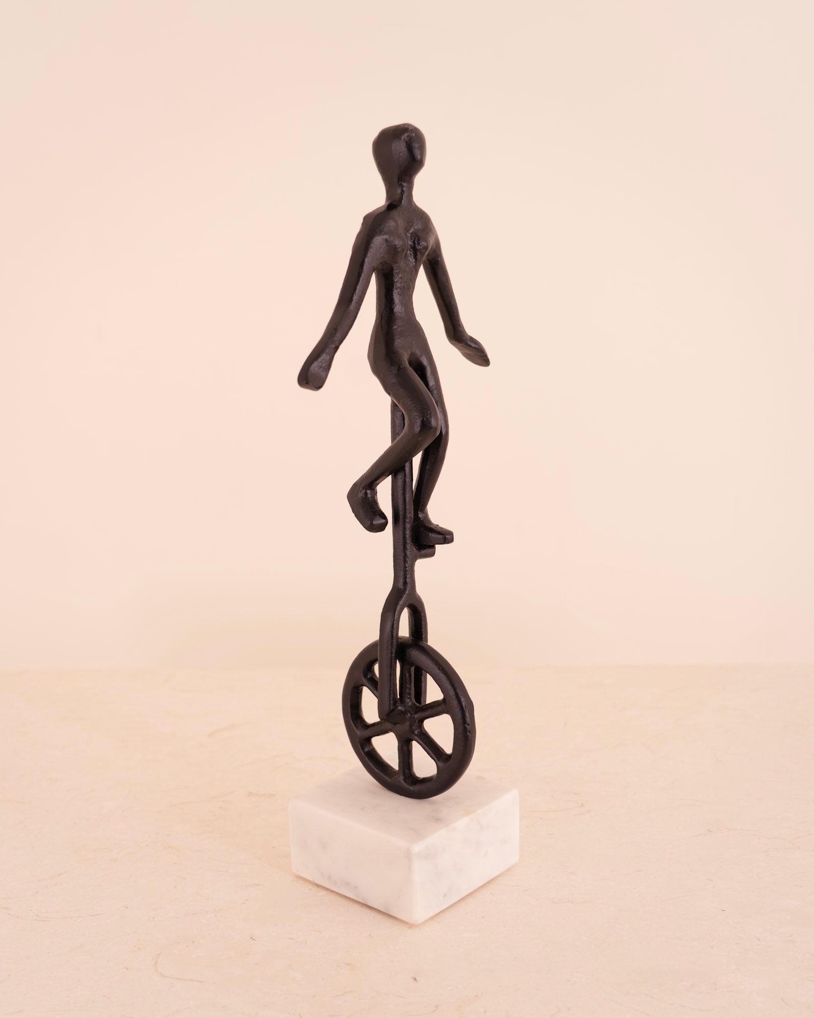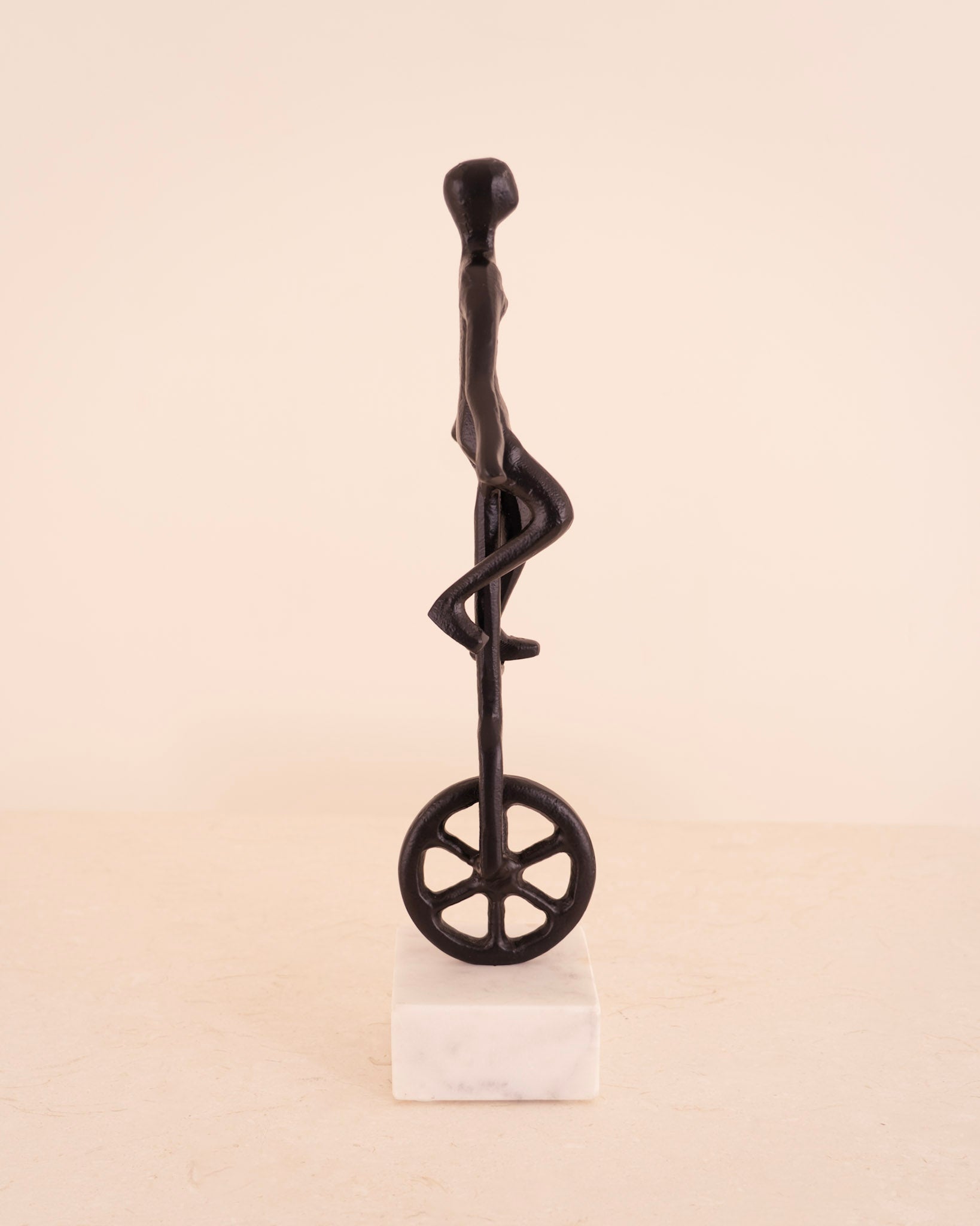 Escultura decorativa con peana cuadrada en mármol blanco y escultura de persona sobre monociclo.