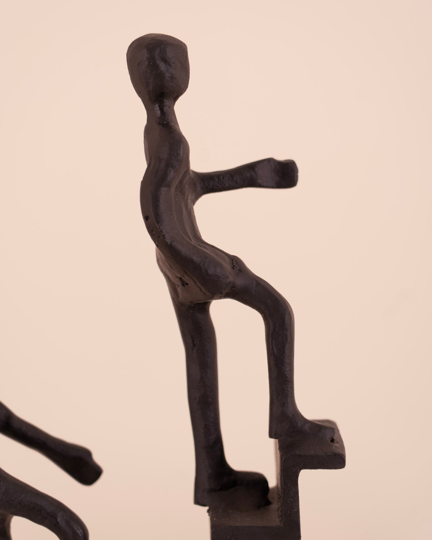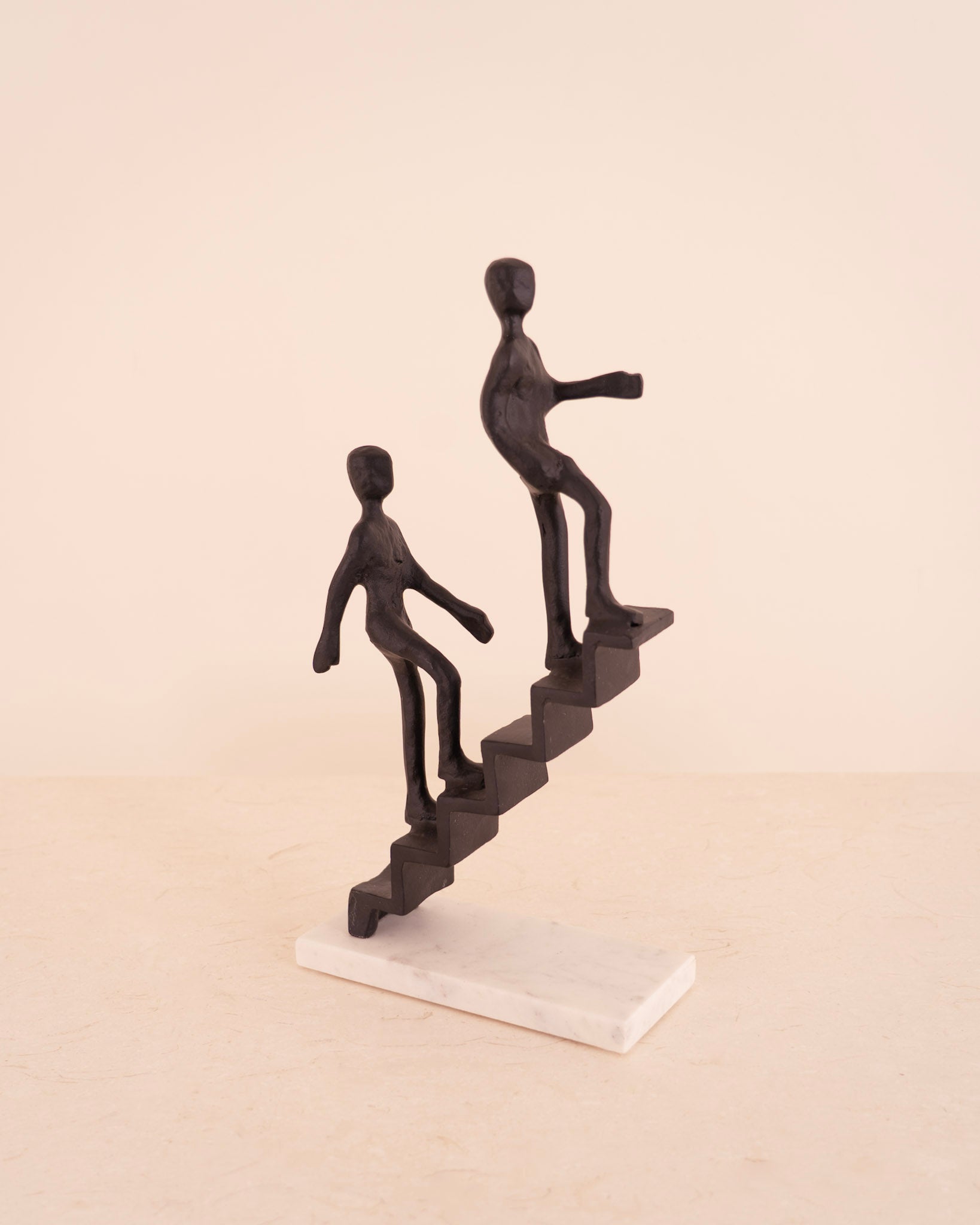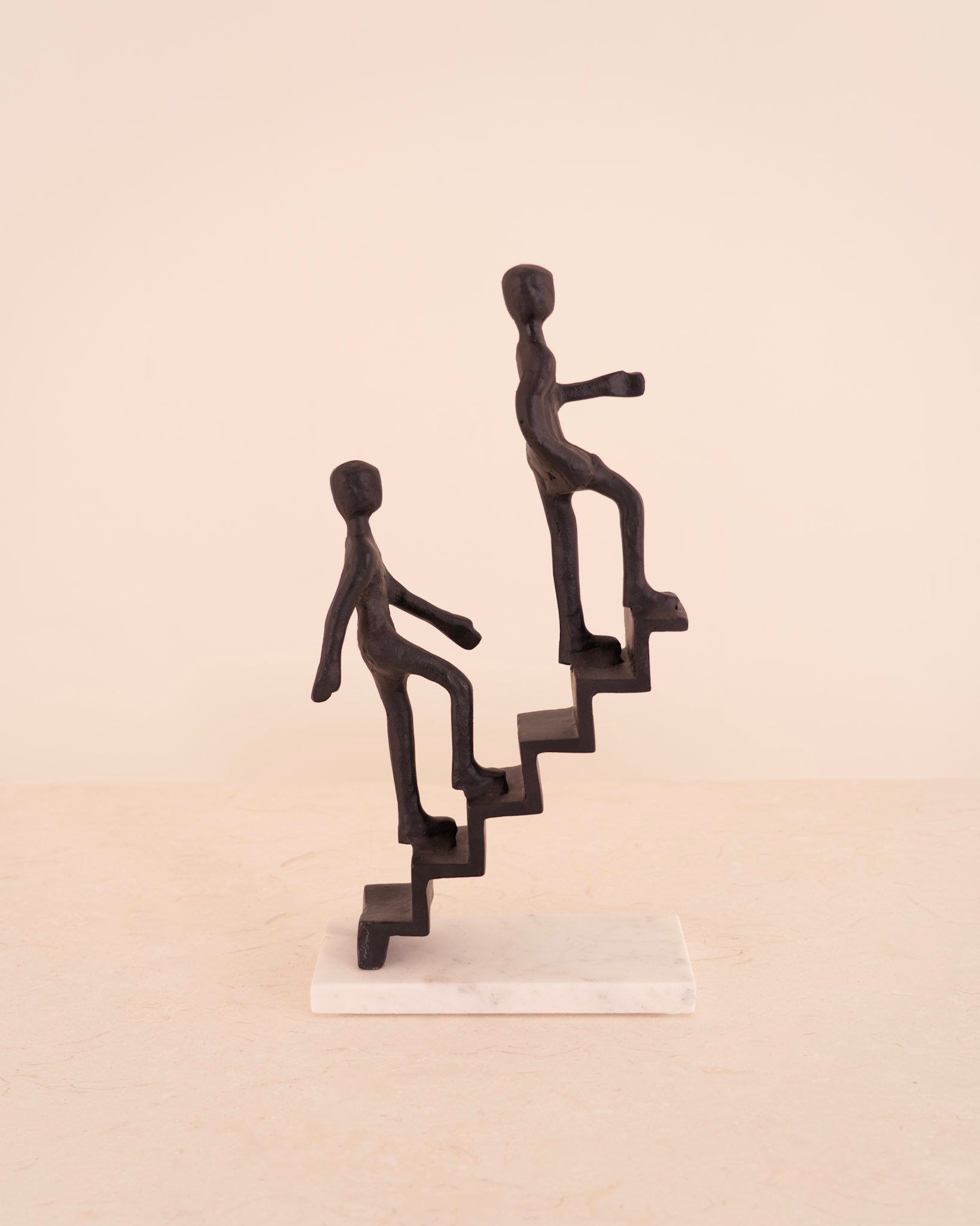 Escultura decorativa con peana de mármol blanco y figuras de dos personas subiendo una escalera.