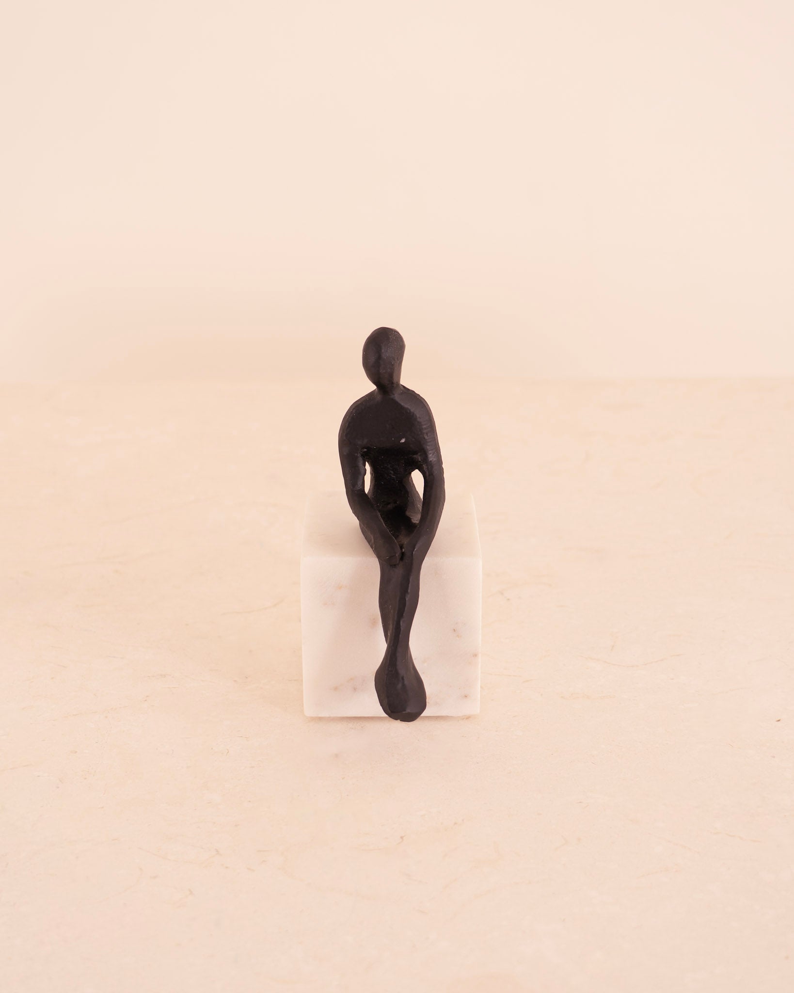 Figura de persona sentada hecha en hierro negro sobre peana de mármol cuadrada.