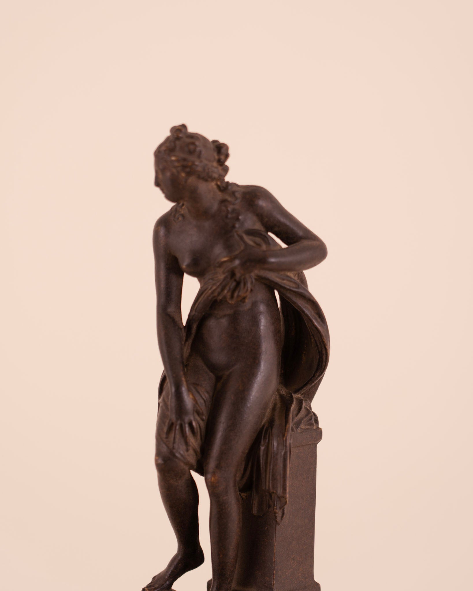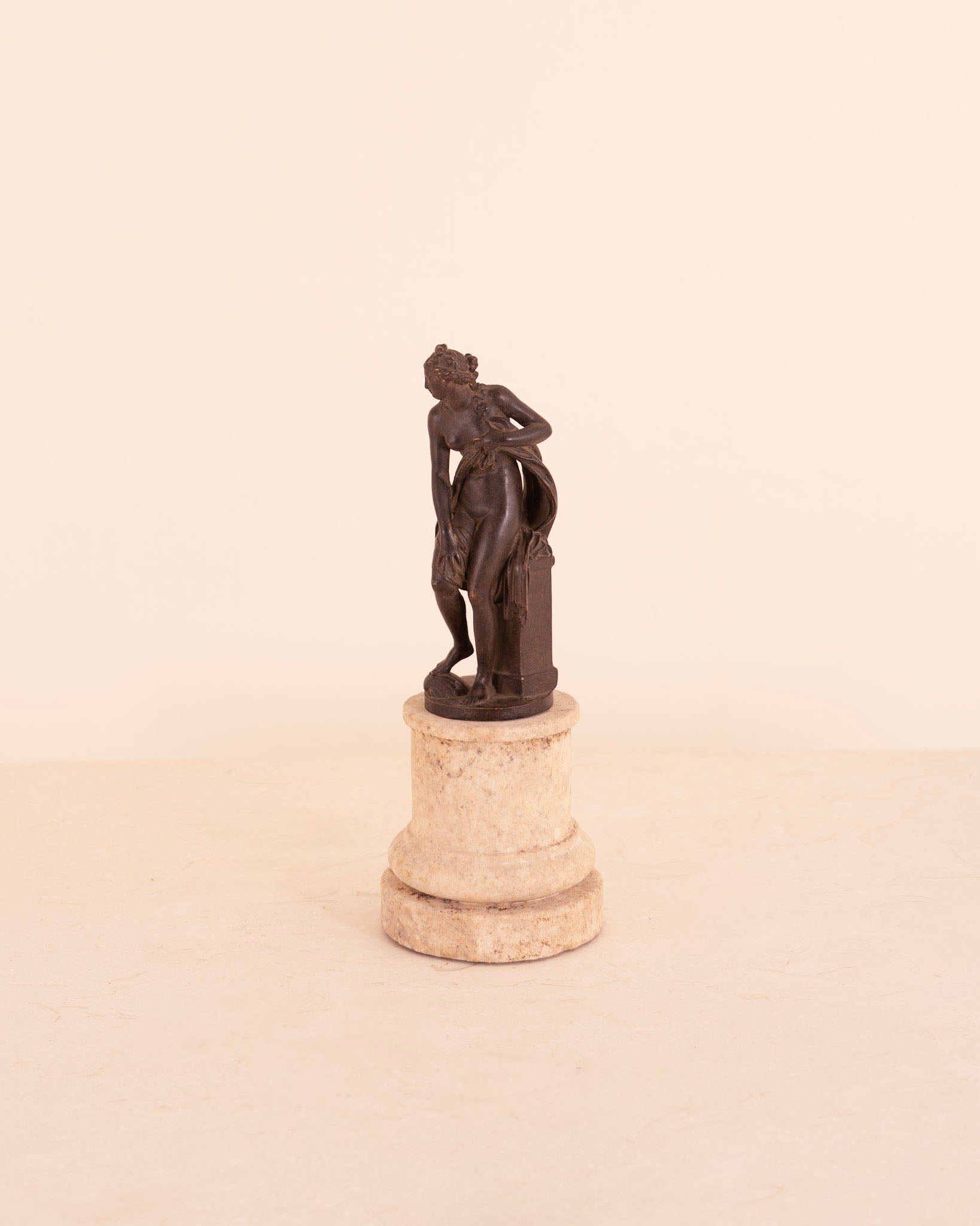 Figura de diosa griega. Fabricada con peana en porcelana arenosa envejecida y mujer en metal negro.