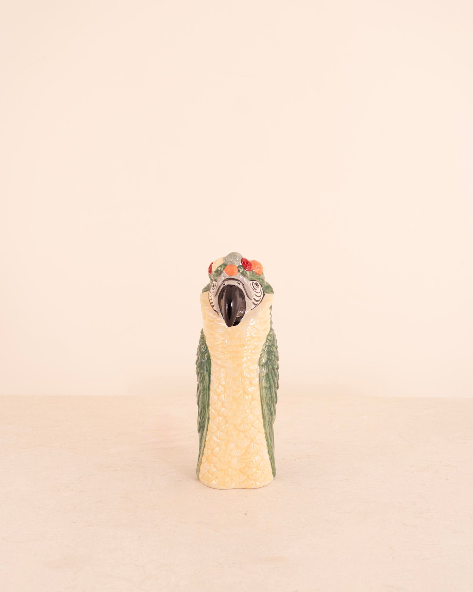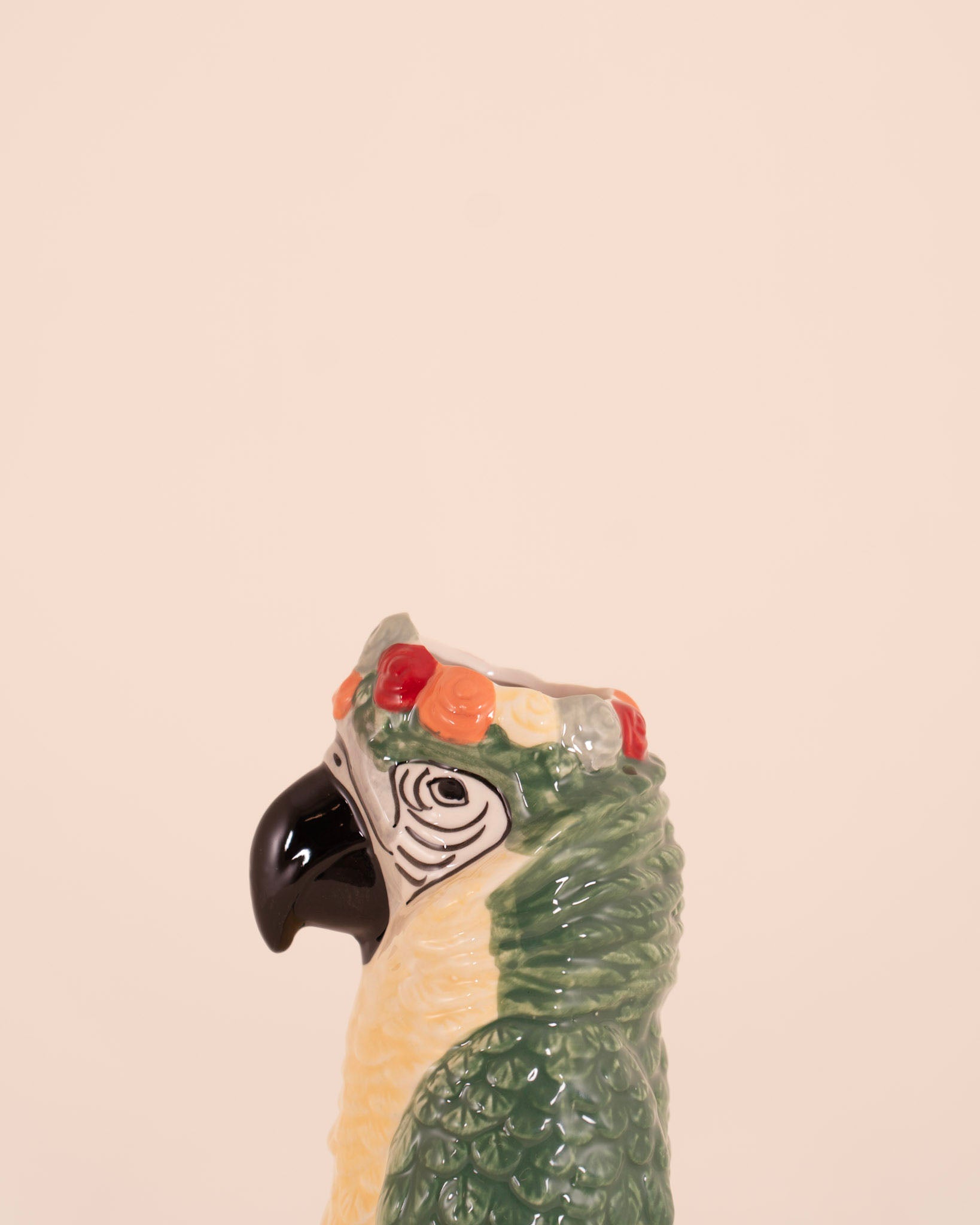 Jarrón de cerámica con acabado en color como amarillo, verde y rojo. Su original diseño en forma de loro le da ese toque actual.