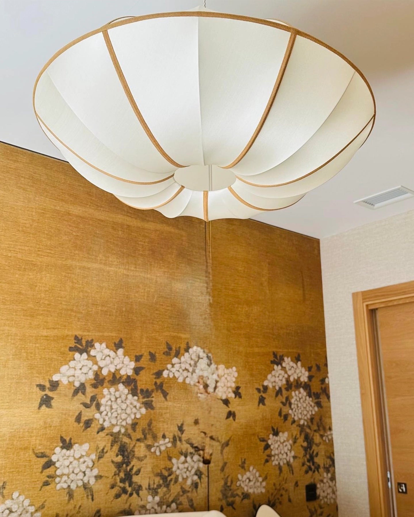 Pantalla de techo fabricada a mano en Indonesia en tejido blanco con vivo de algodón blanco. Una pieza perfecta si buscas una luminaria especial para tu hogar. Enfilaje con caída de 1 metros. Posibilidad de fabricarlo más largo.