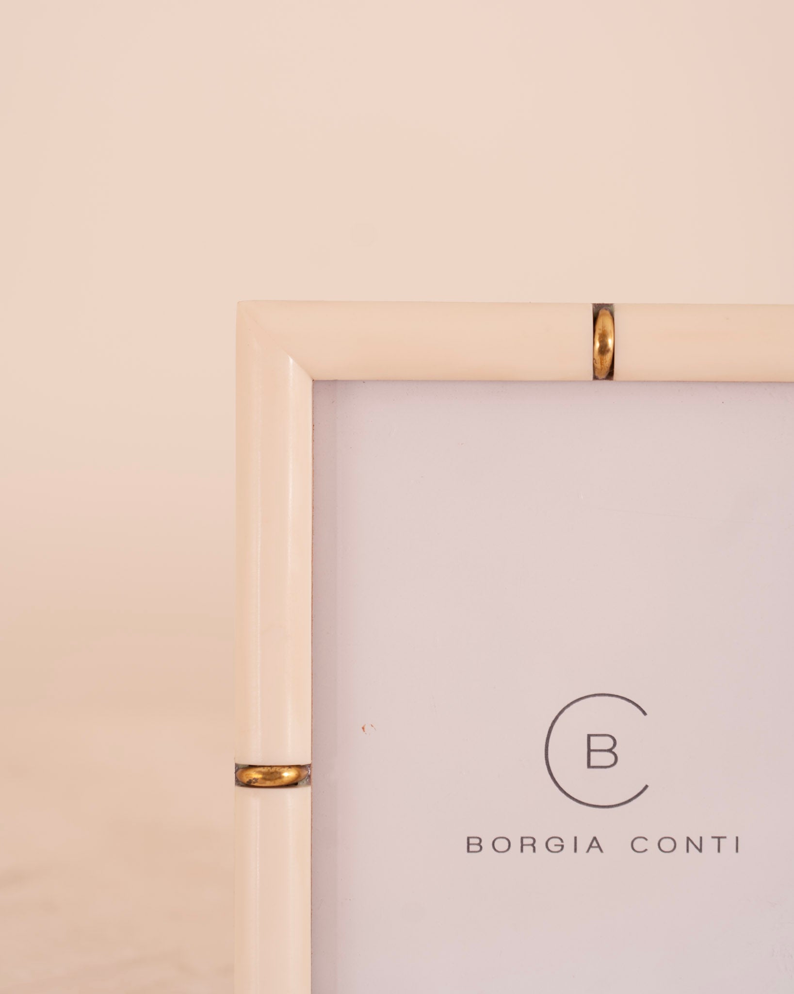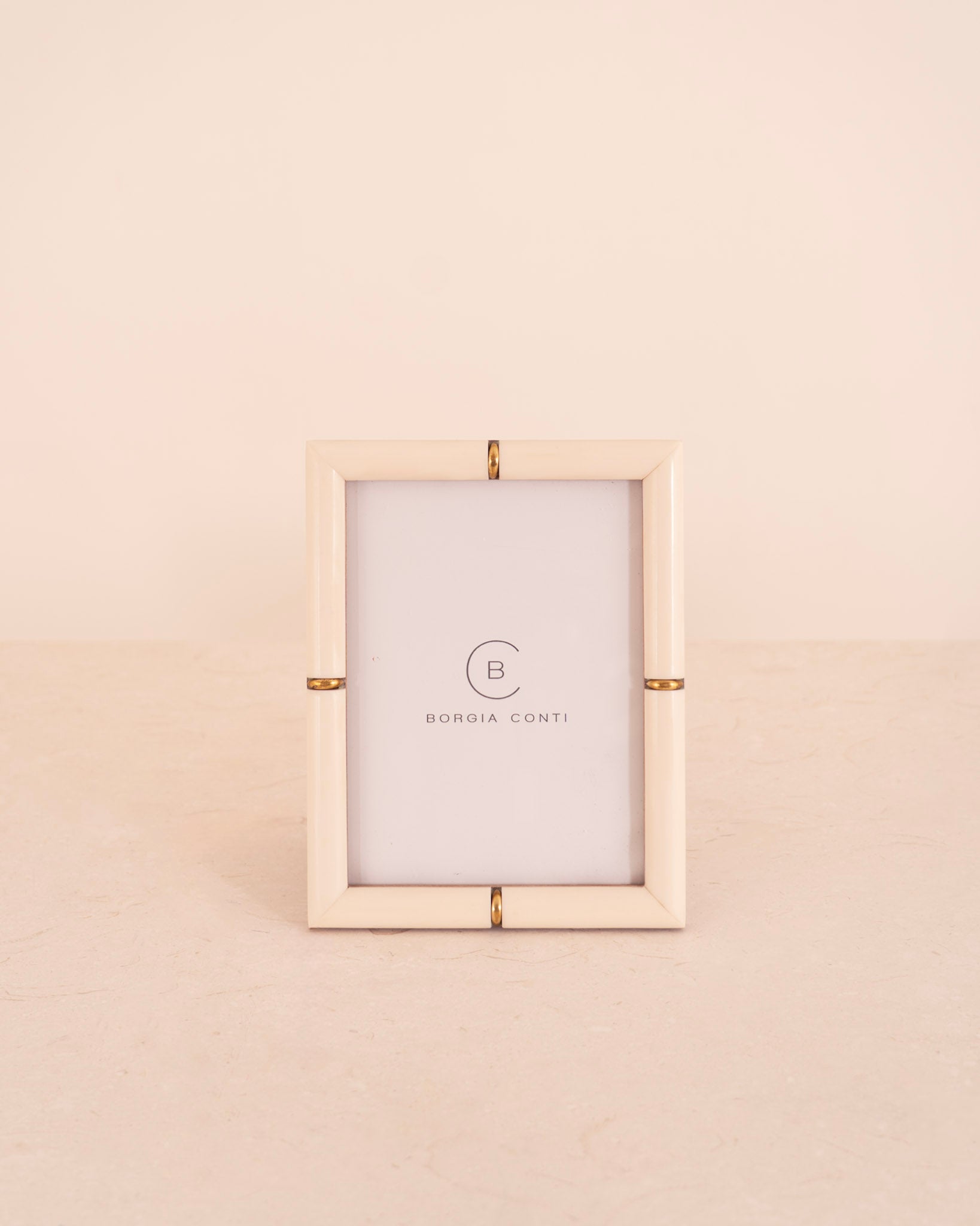 Marco de fotos fabricado en madera lacada en blanco y con detalle de medio aro en dorado envejecido.