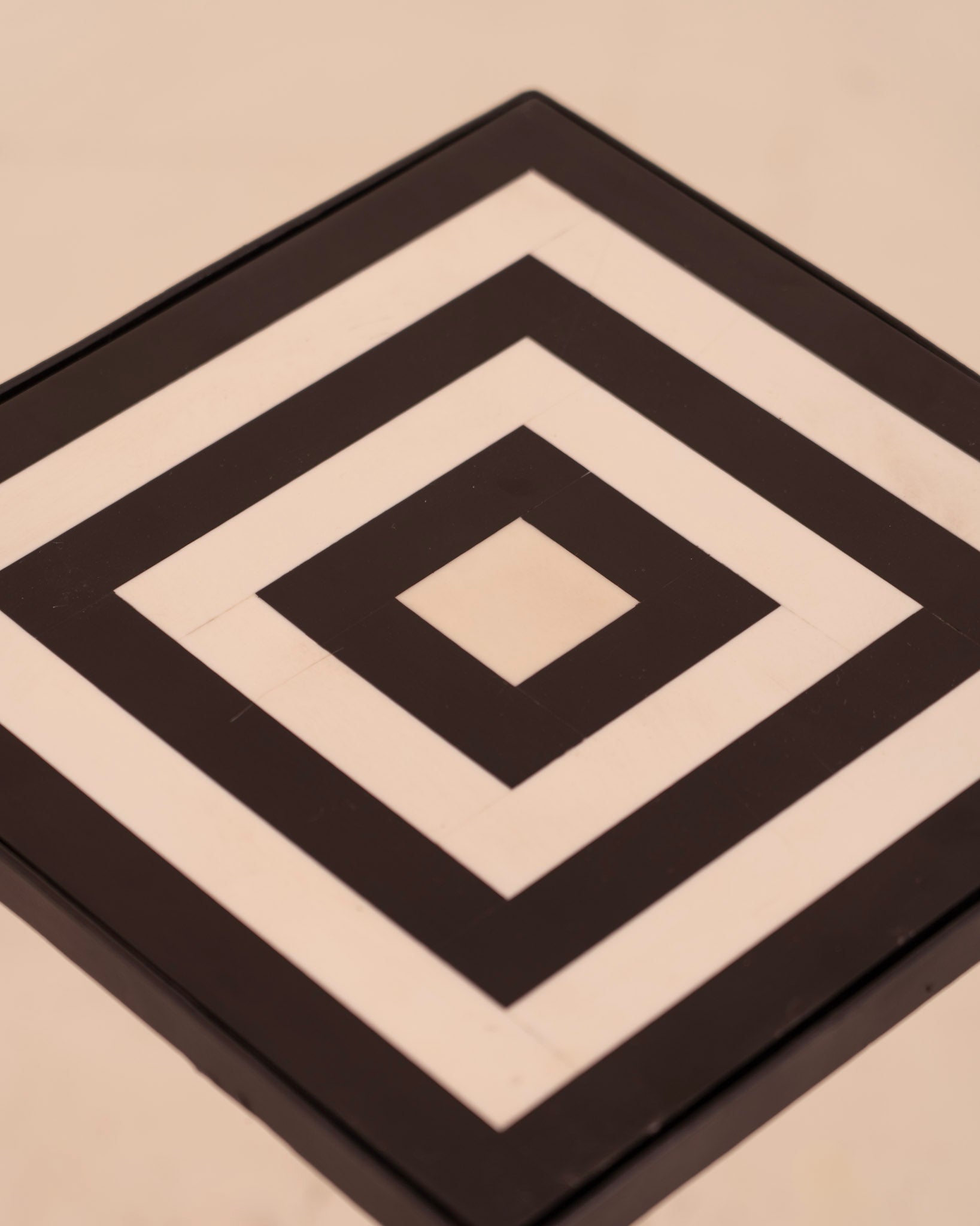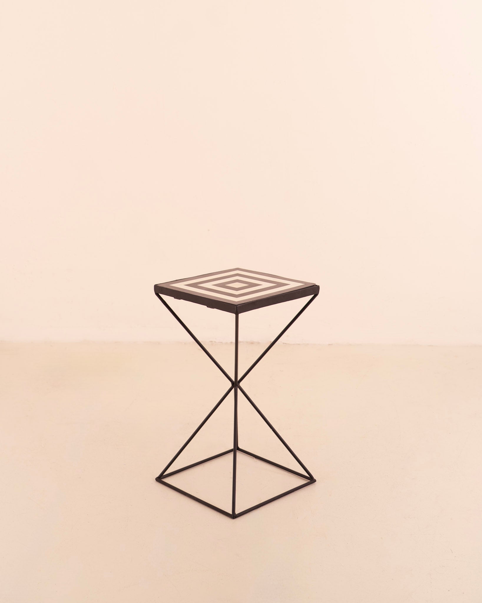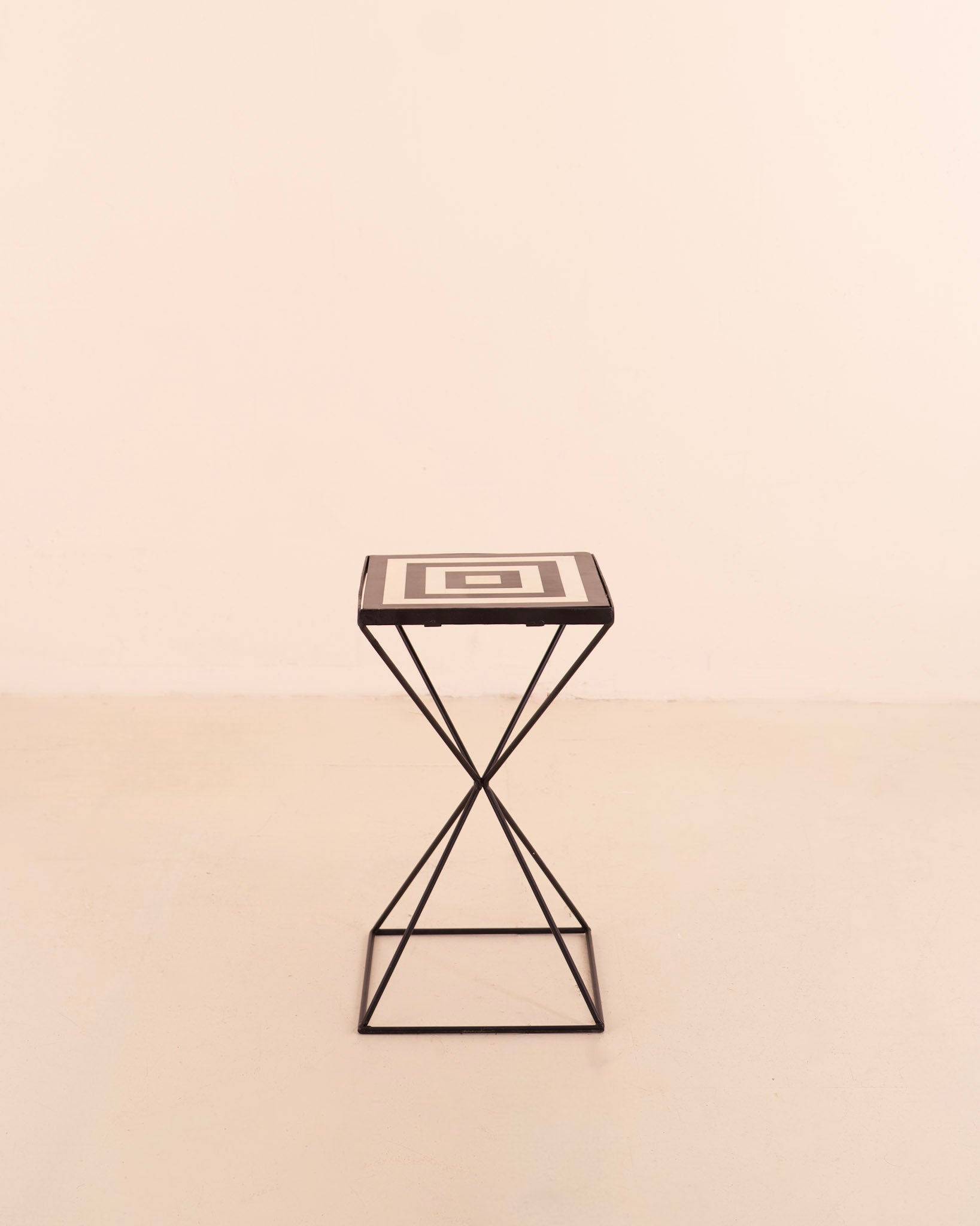 Mesa auxiliar cuadrada en metal y madera. Patas cruzadas y tablero en estampado geométrico blanco y negro.