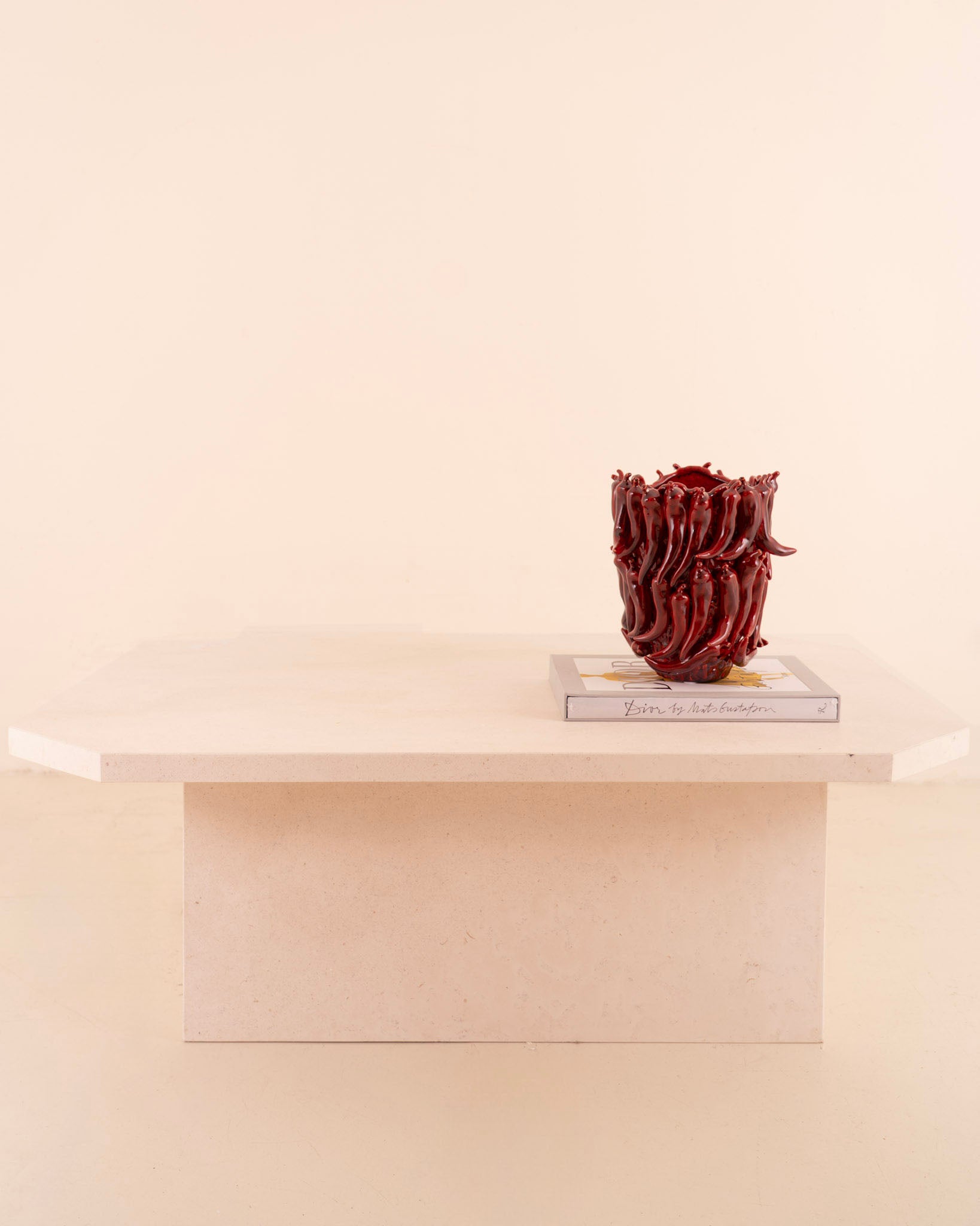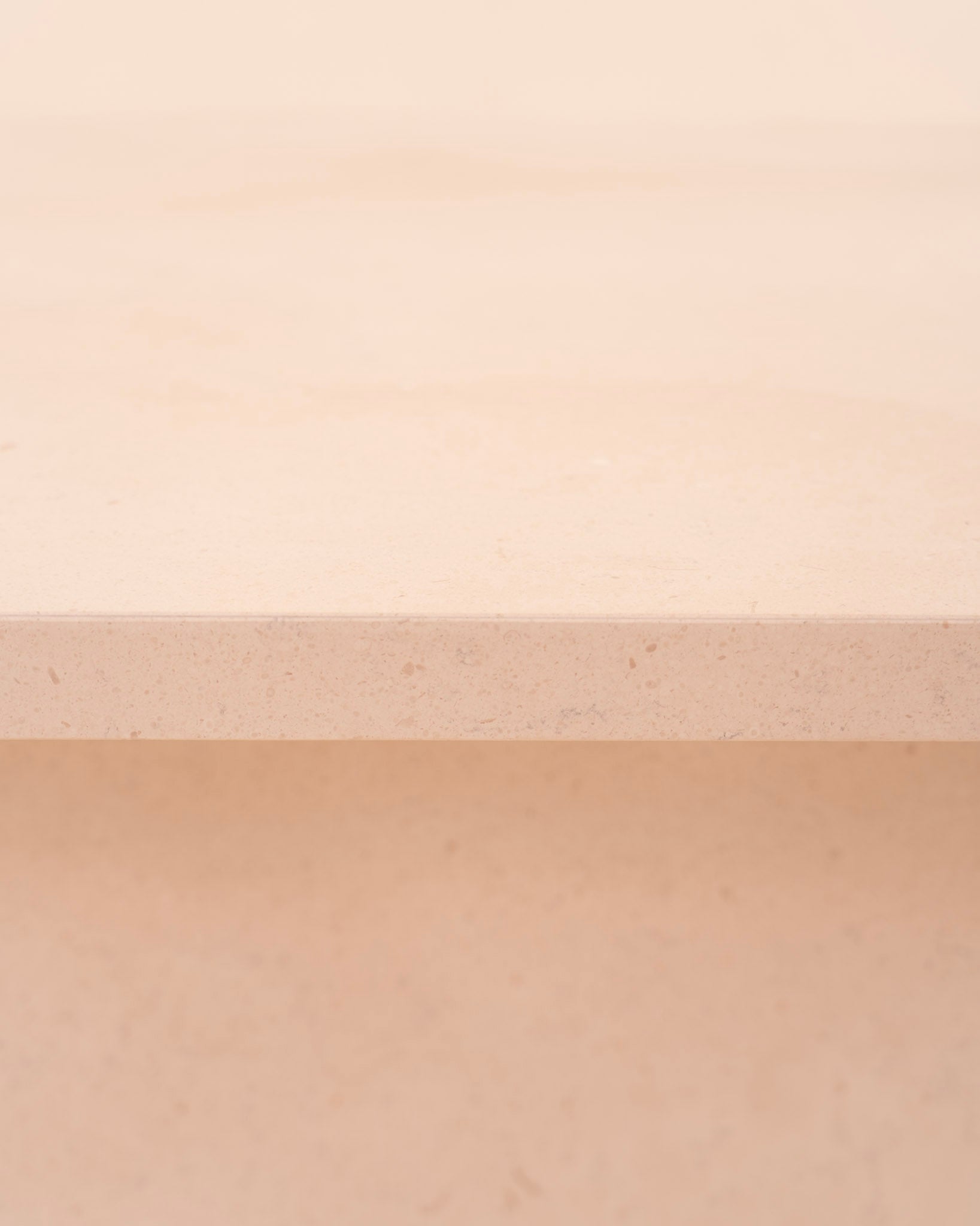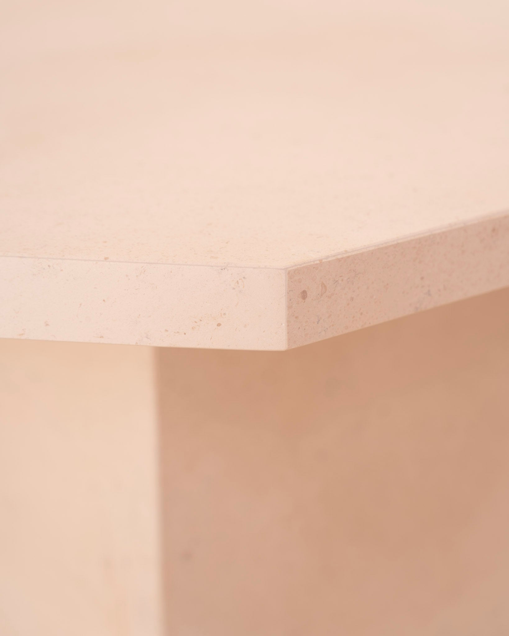 Mesa de centro fabricada completamente en piedra caliza Alba. Su original diseño de las esquinas en forma de pecho paloma le da ese toque distinto que estás buscando para tu salón.