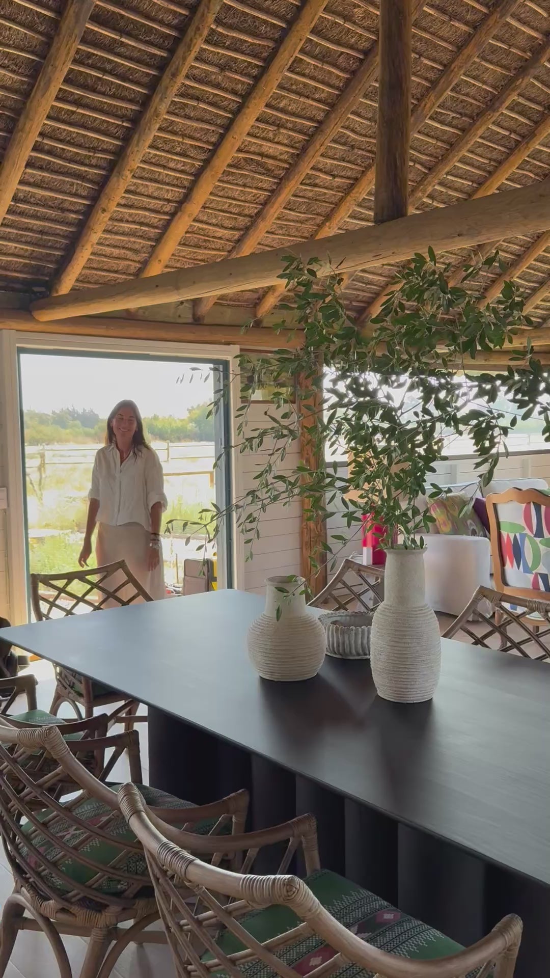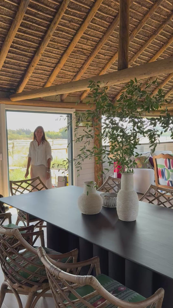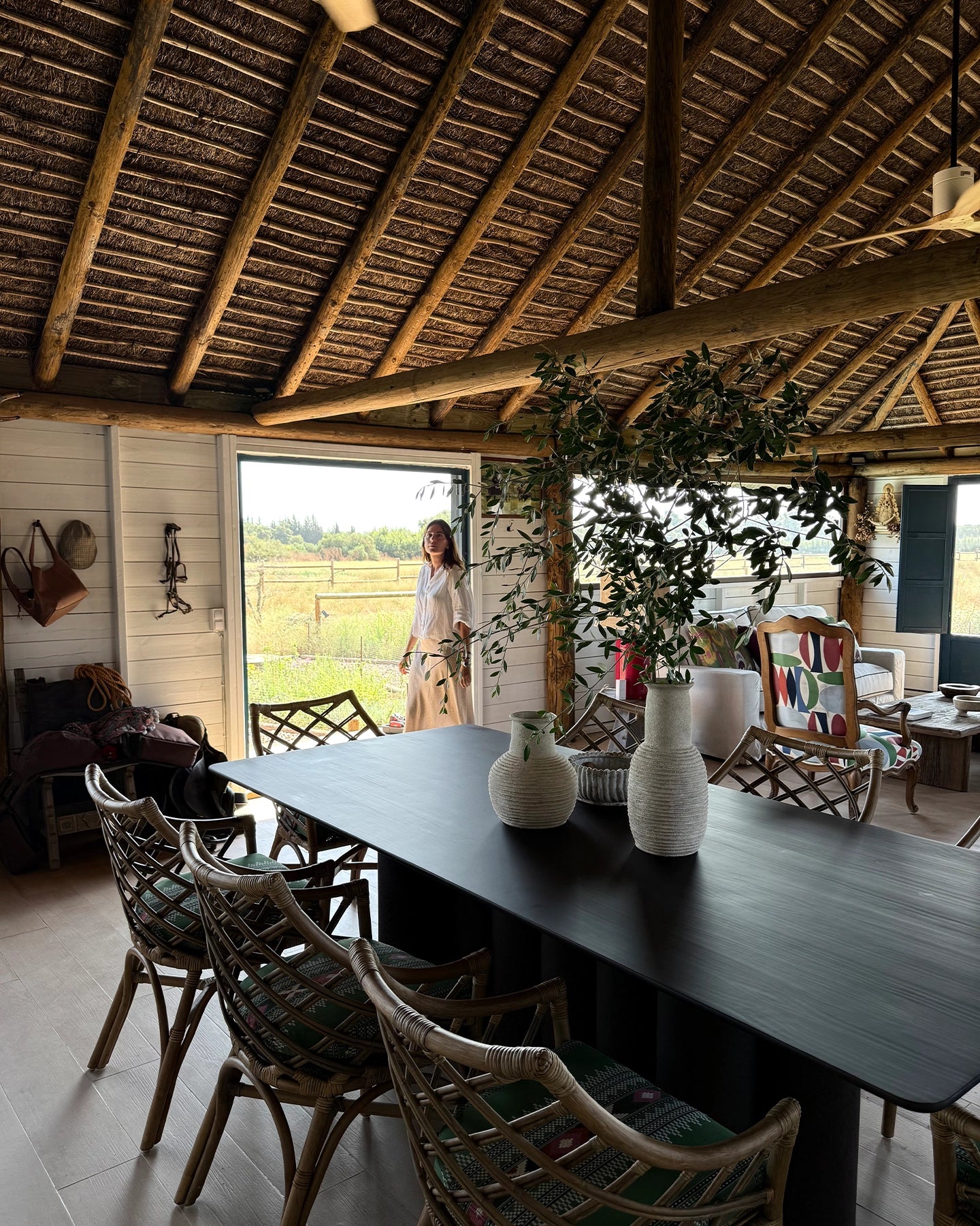 Espectacular mesa de comedor fabricada en madera de roble envejecido marrón. Una pieza espectacular que usamos para el proyecto de interiorismo de este refugio familiar de Lourdes Montes y Francisco Rivera.