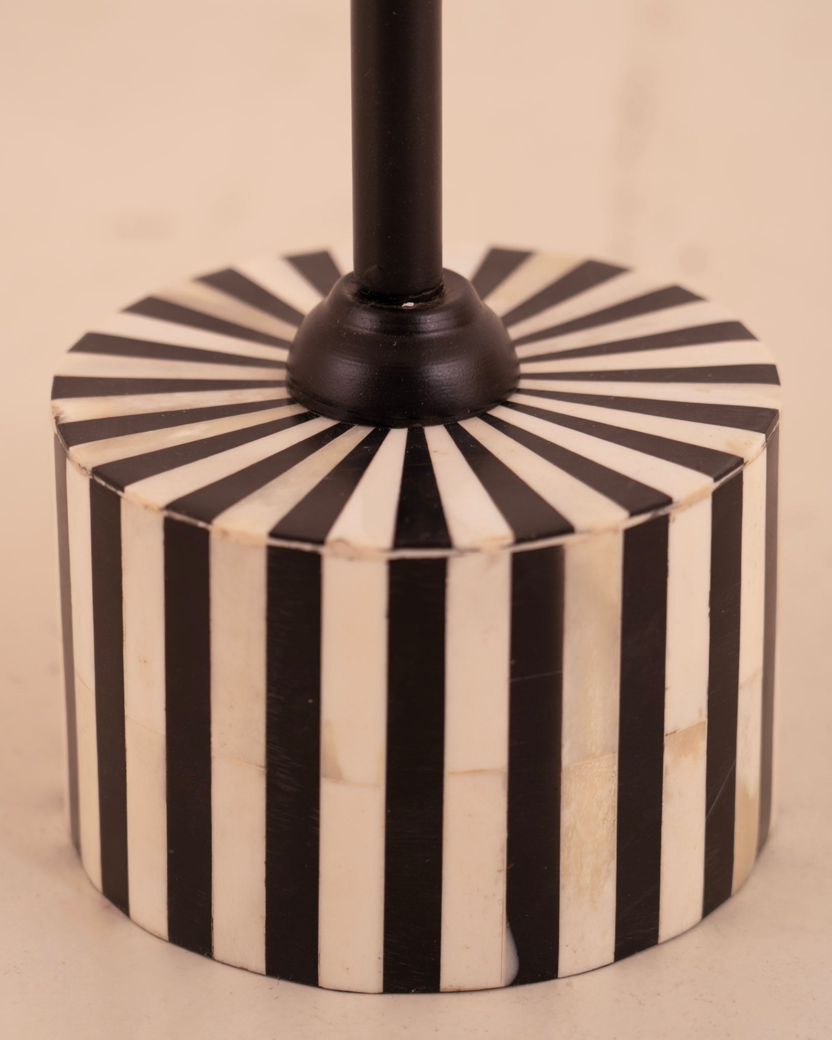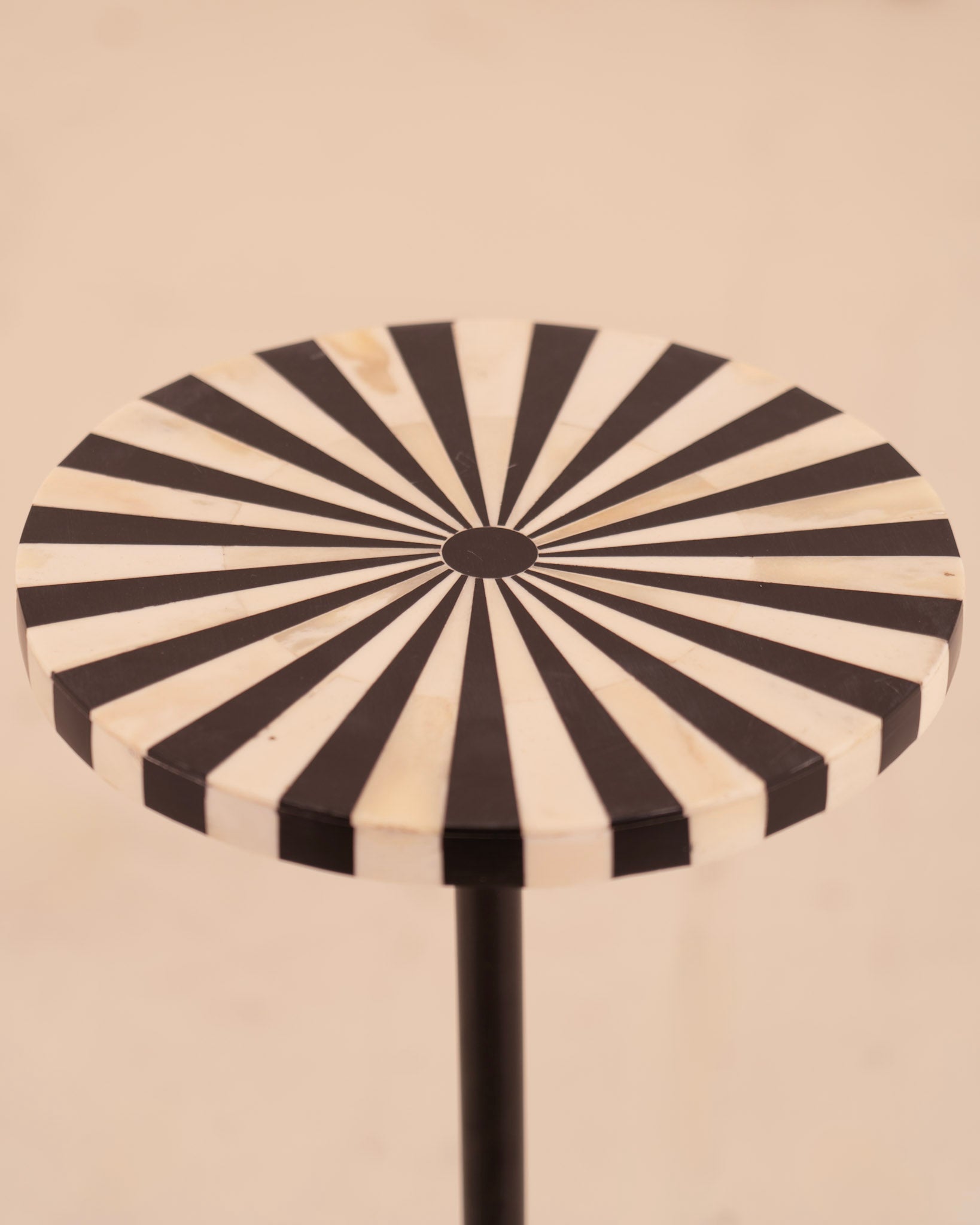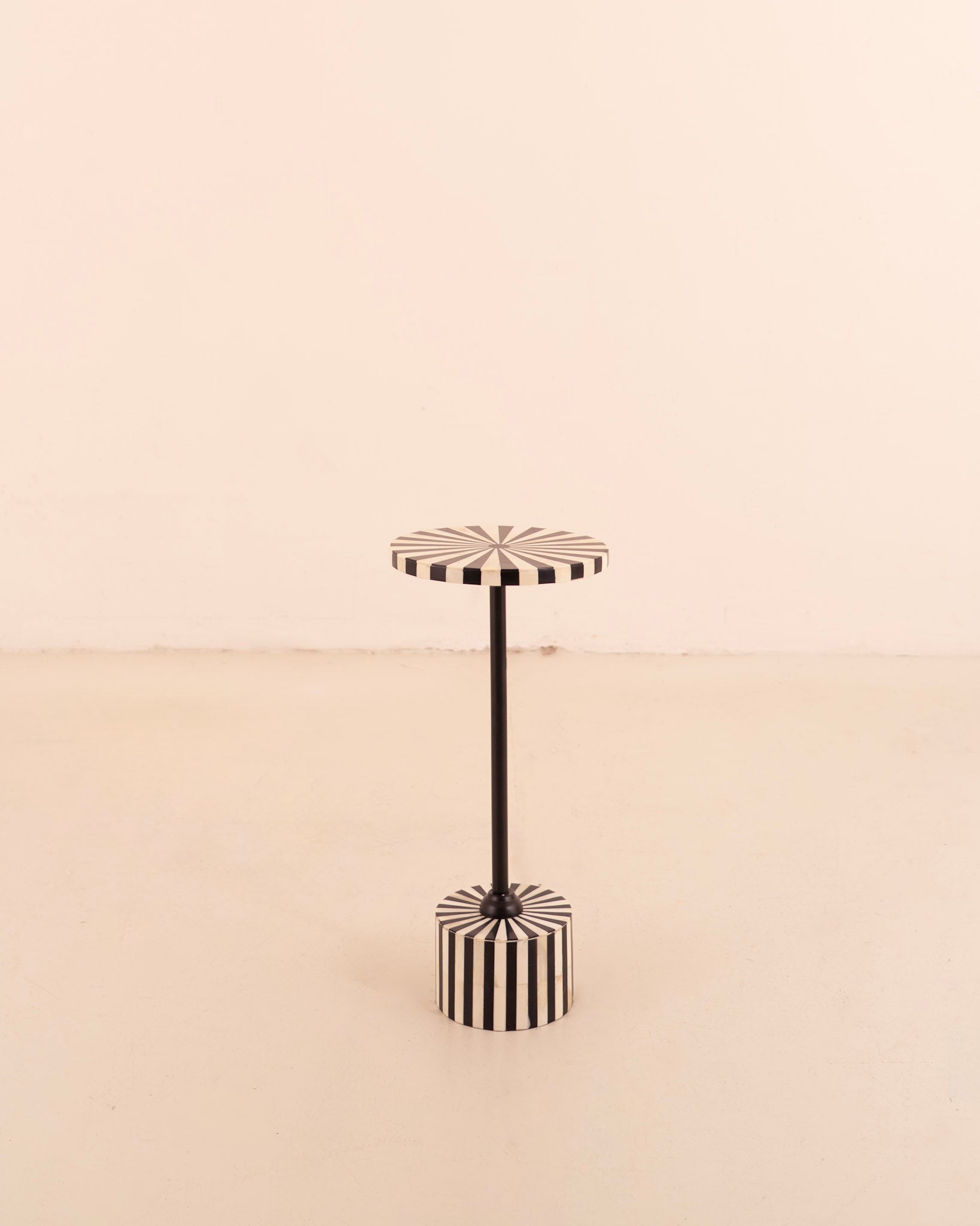 Mesa auxiliar fabricada en hueso en tono blanco y negro. Tubo en metal negro para darle un diseño de altura y elegante.
