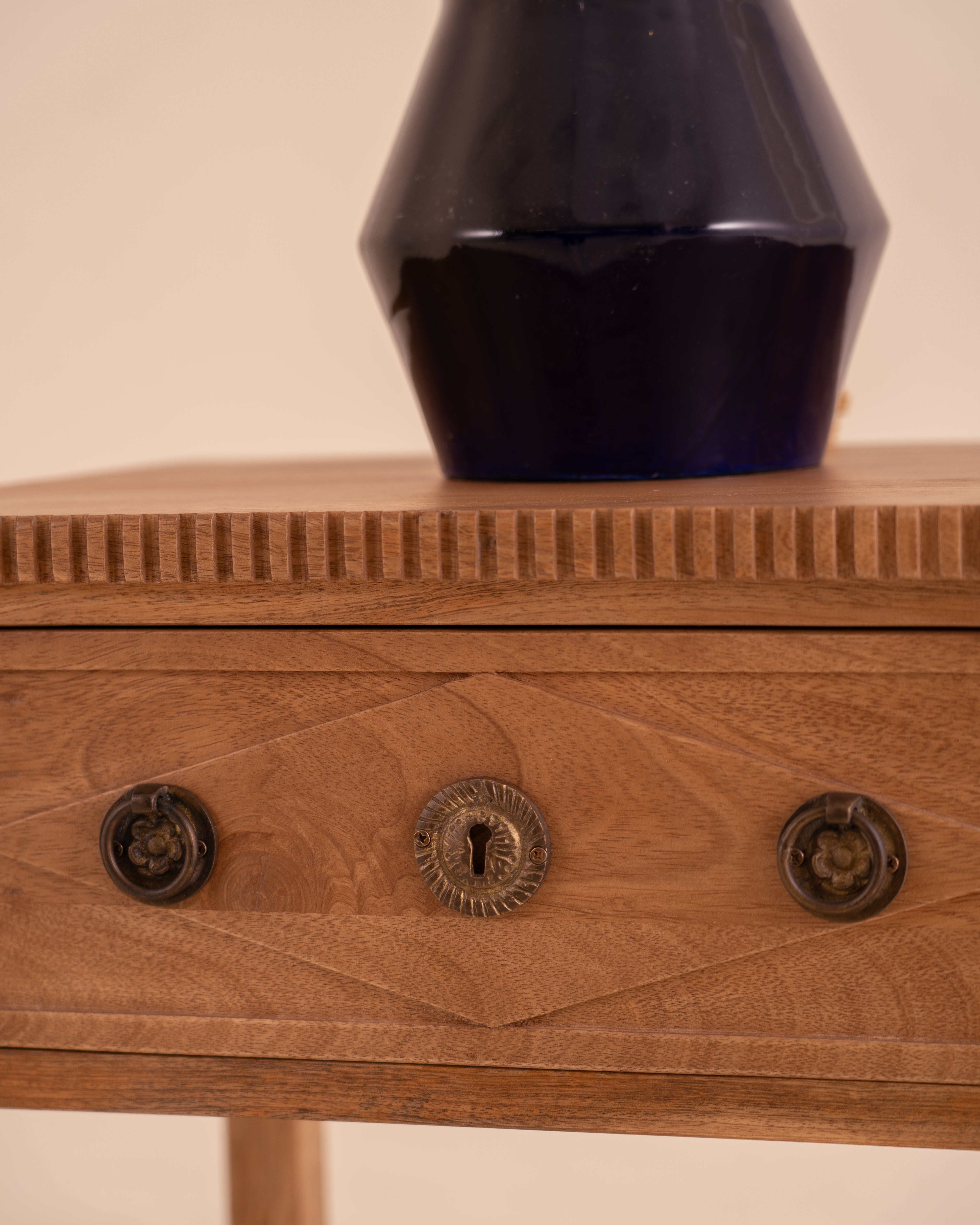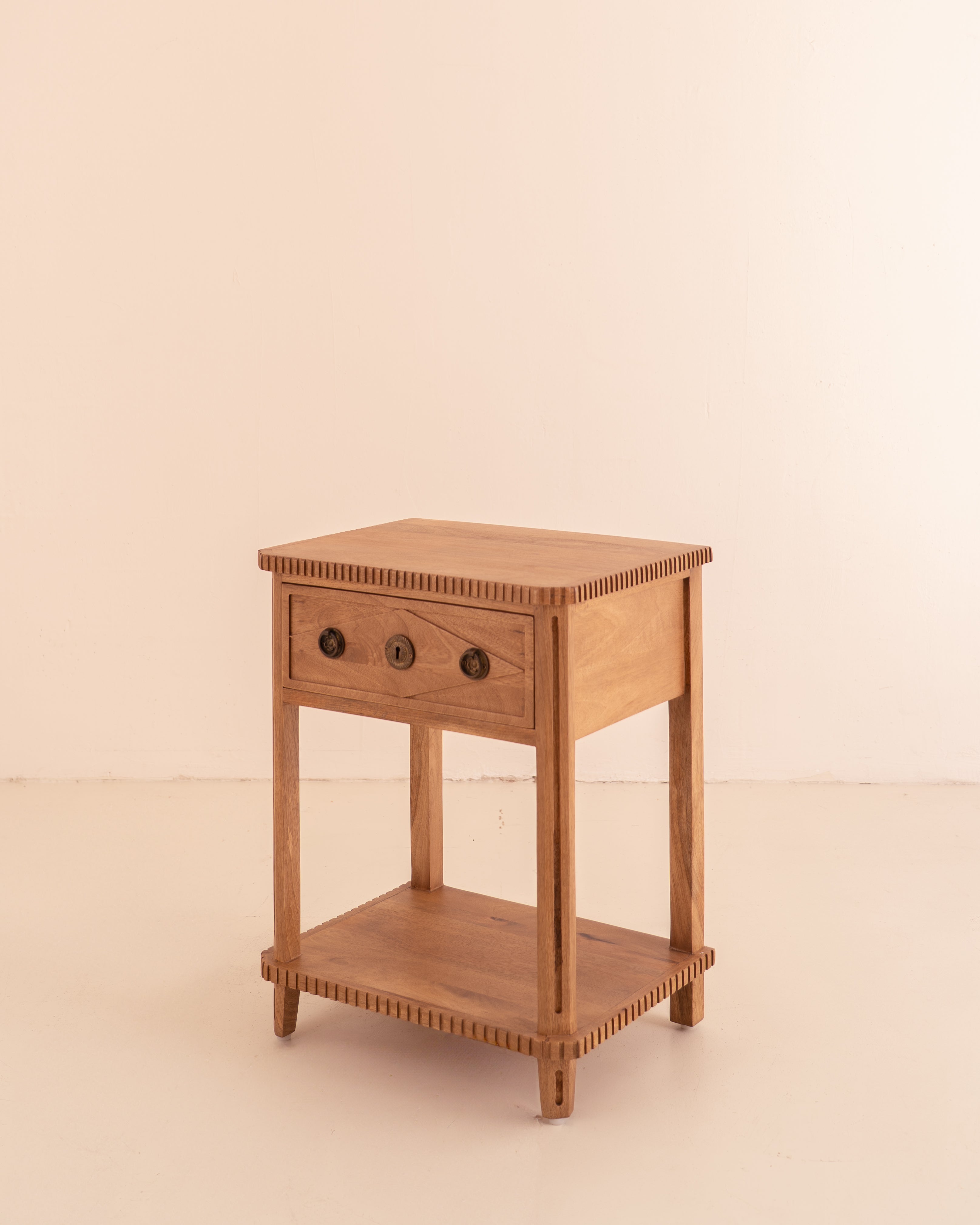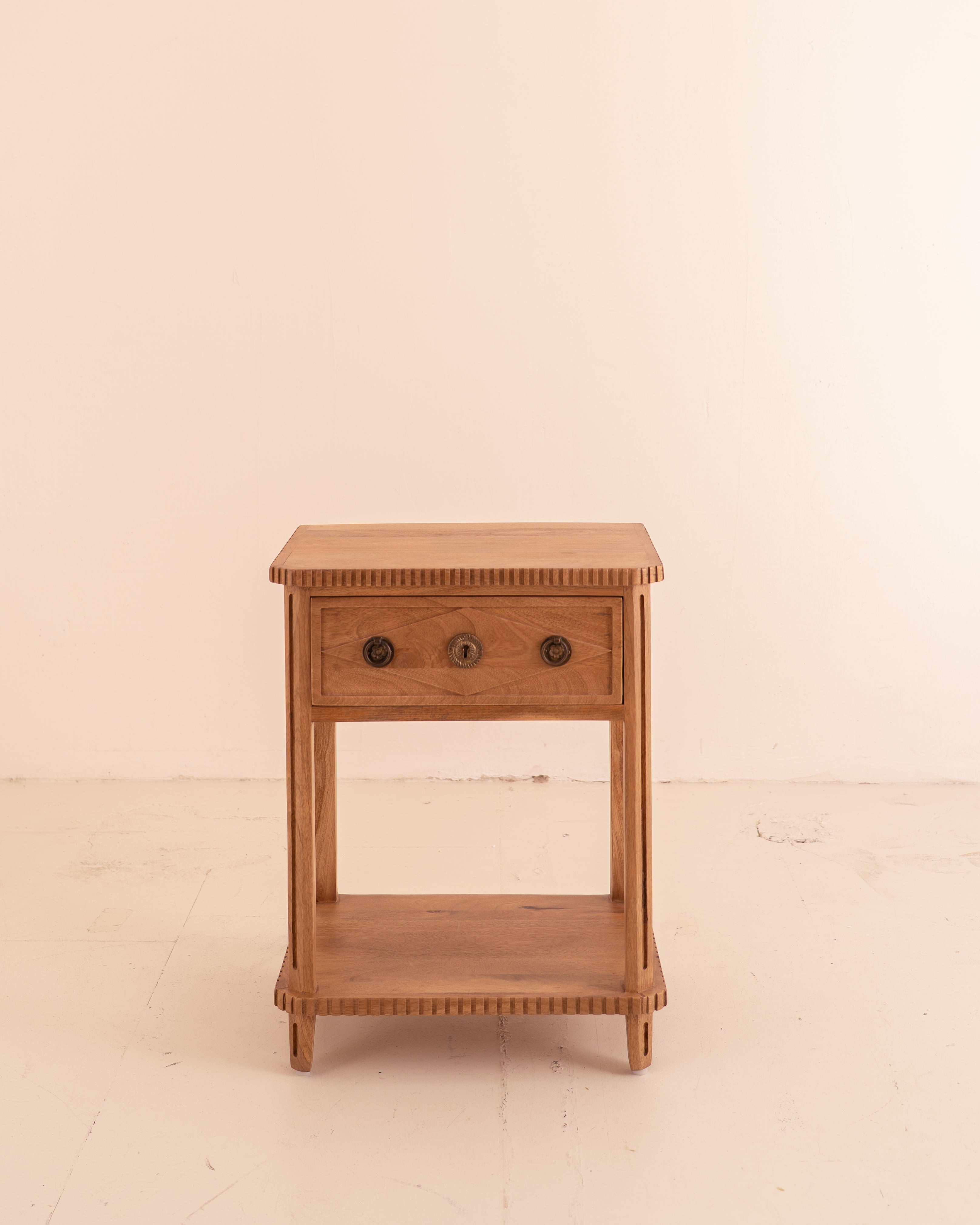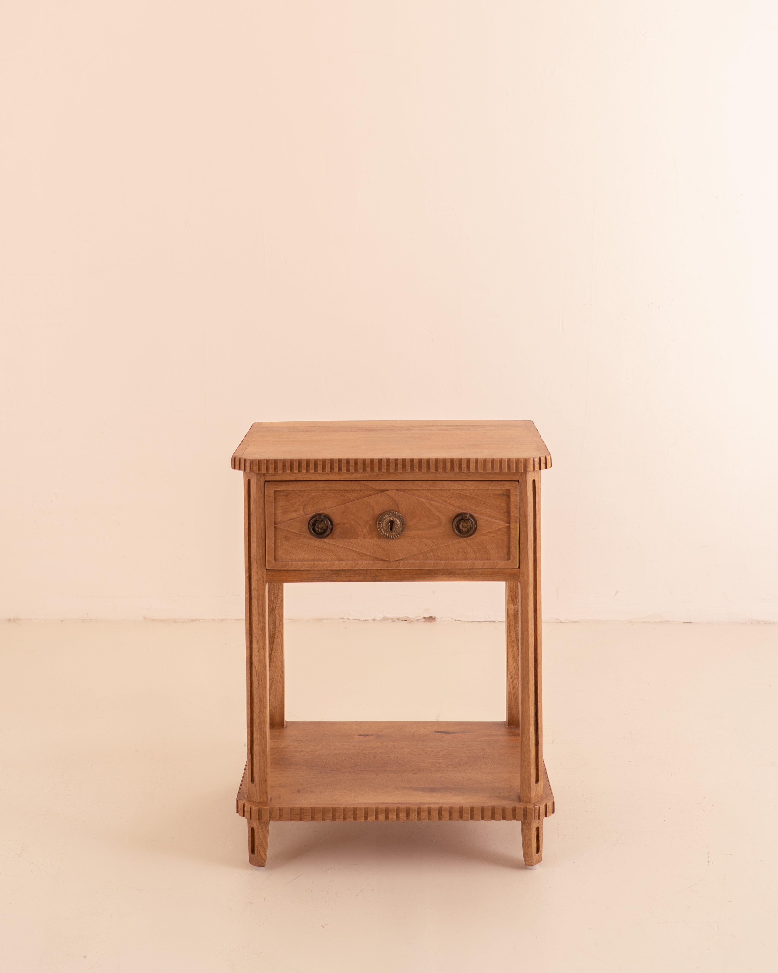 Mesita de noche fabricada en madera natural con detalles circulares y tiradores envejevidos. Cuenta con un cajón y una balda inferior.