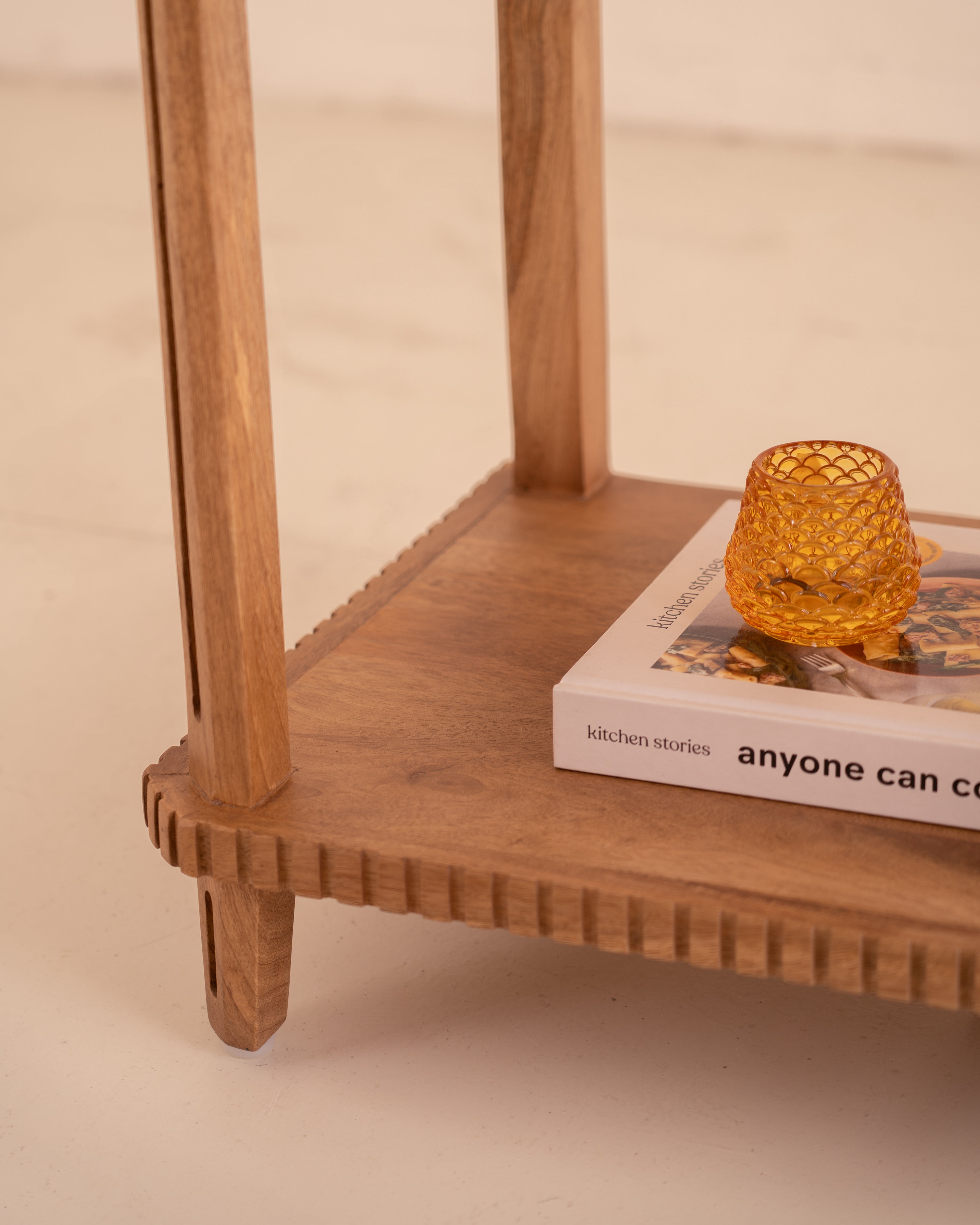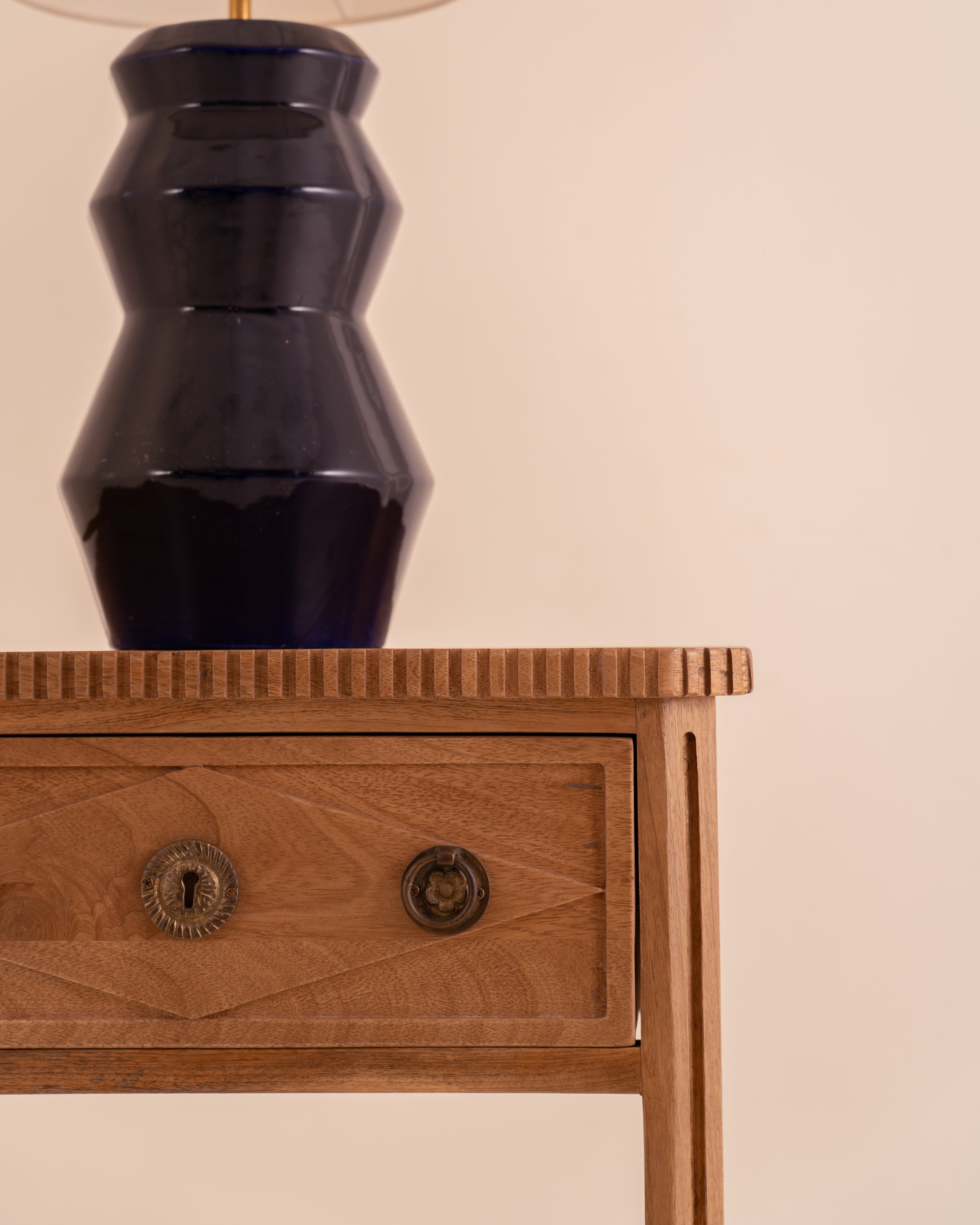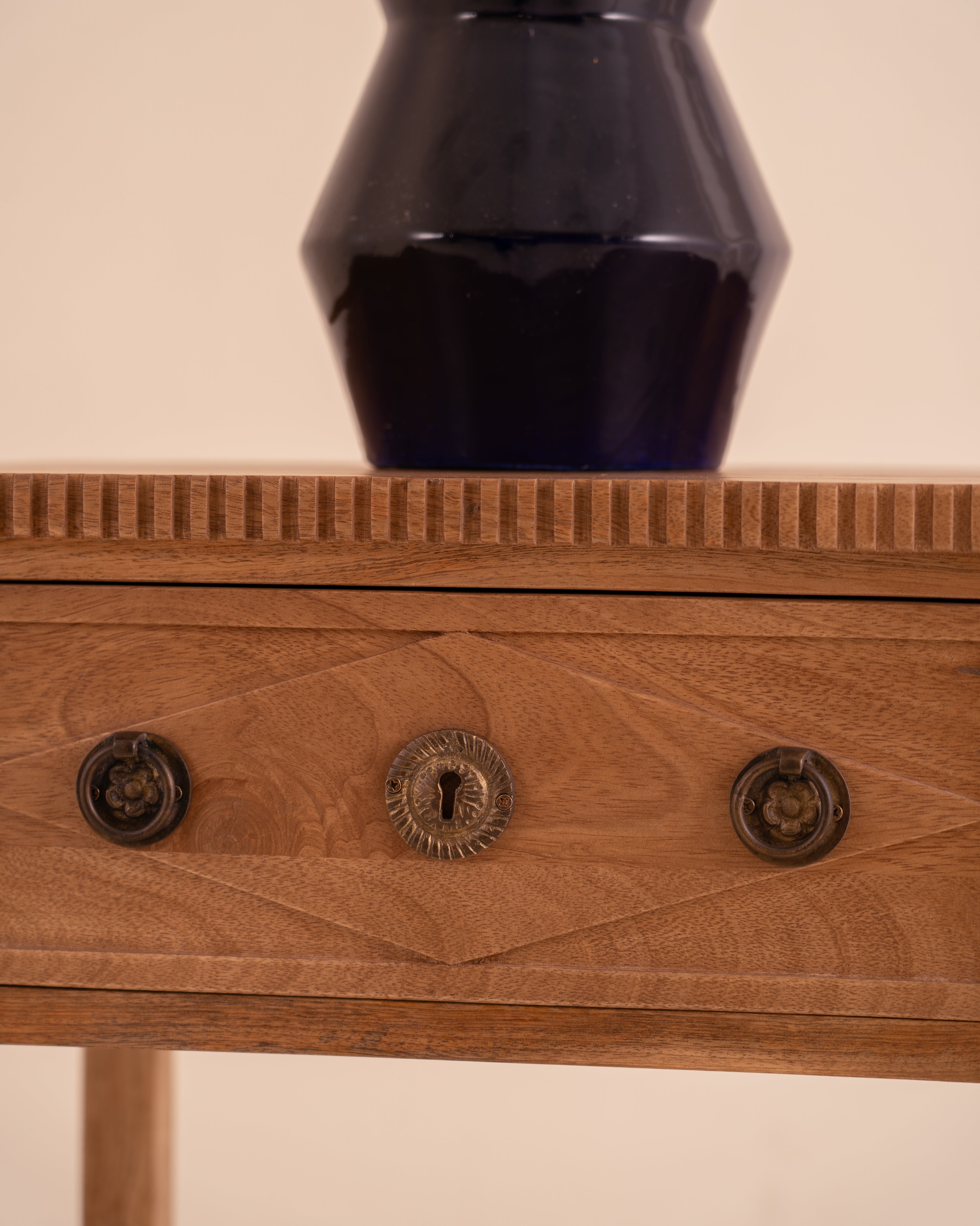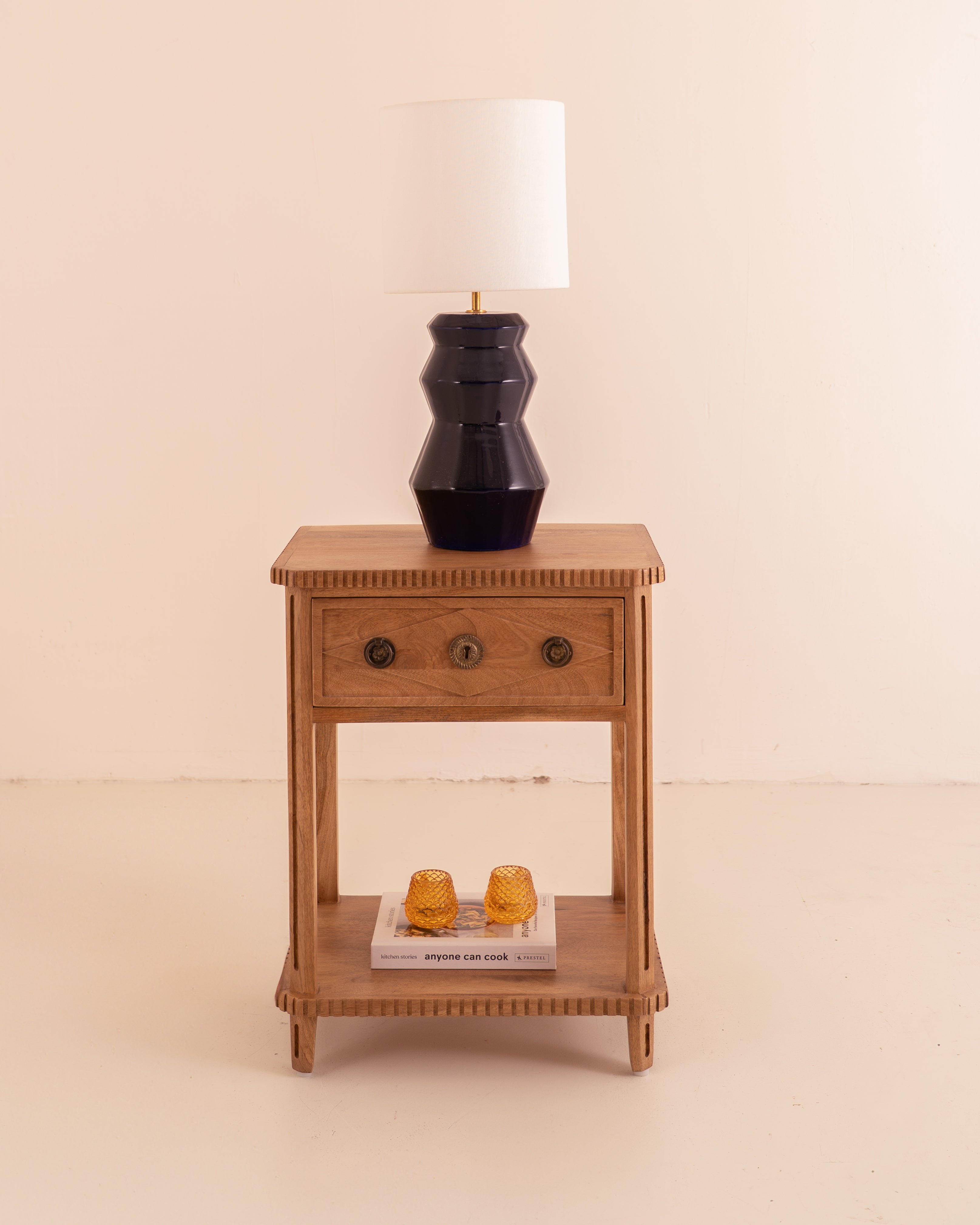 Mesita de noche fabricada en madera natural con detalles circulares y tiradores envejevidos. Cuenta con un cajón y una balda inferior.