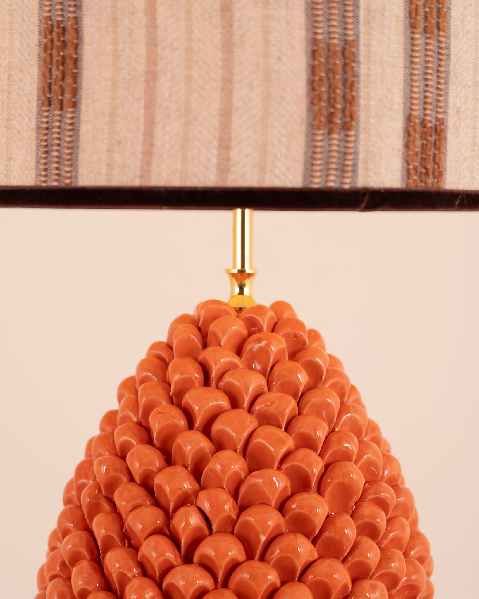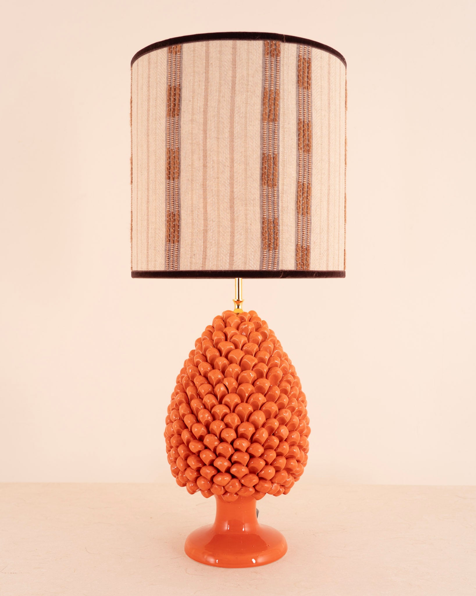 Preciosa pantalla fabricada con tela rústica en tonos beige, camel y marrón. Vivo en lino de color marrón oscuro.