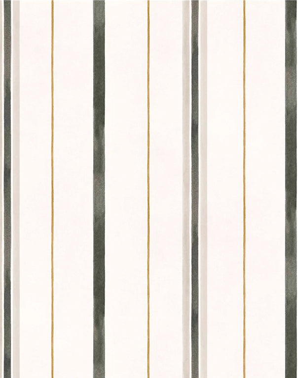 Papel pintado vinílico con dibujo de rayas verticales en color gris oscuro, negro y mostaza.