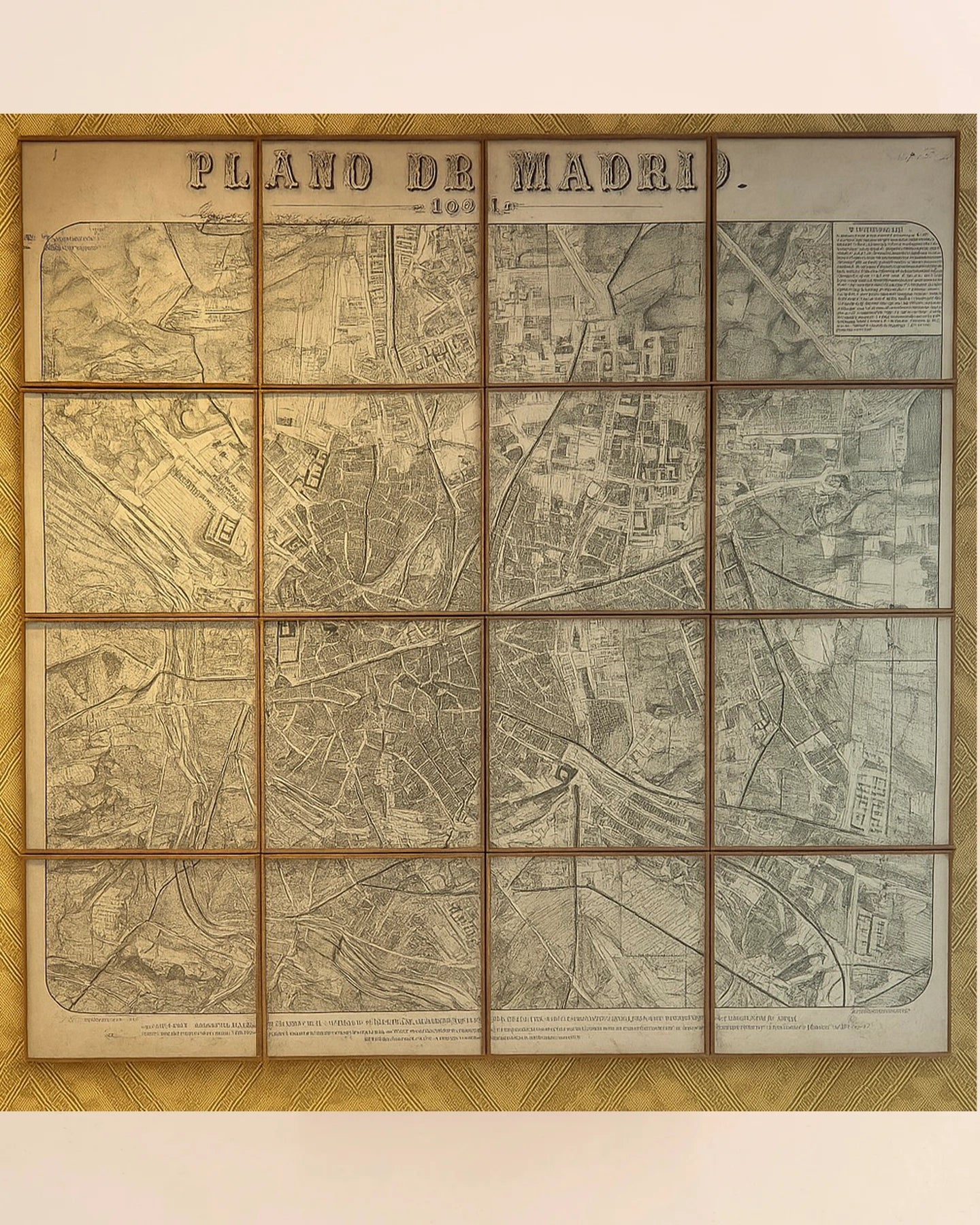 Continuar comprandoPlano de Madrid antiguo dividido en distintos cuadros por zonas.