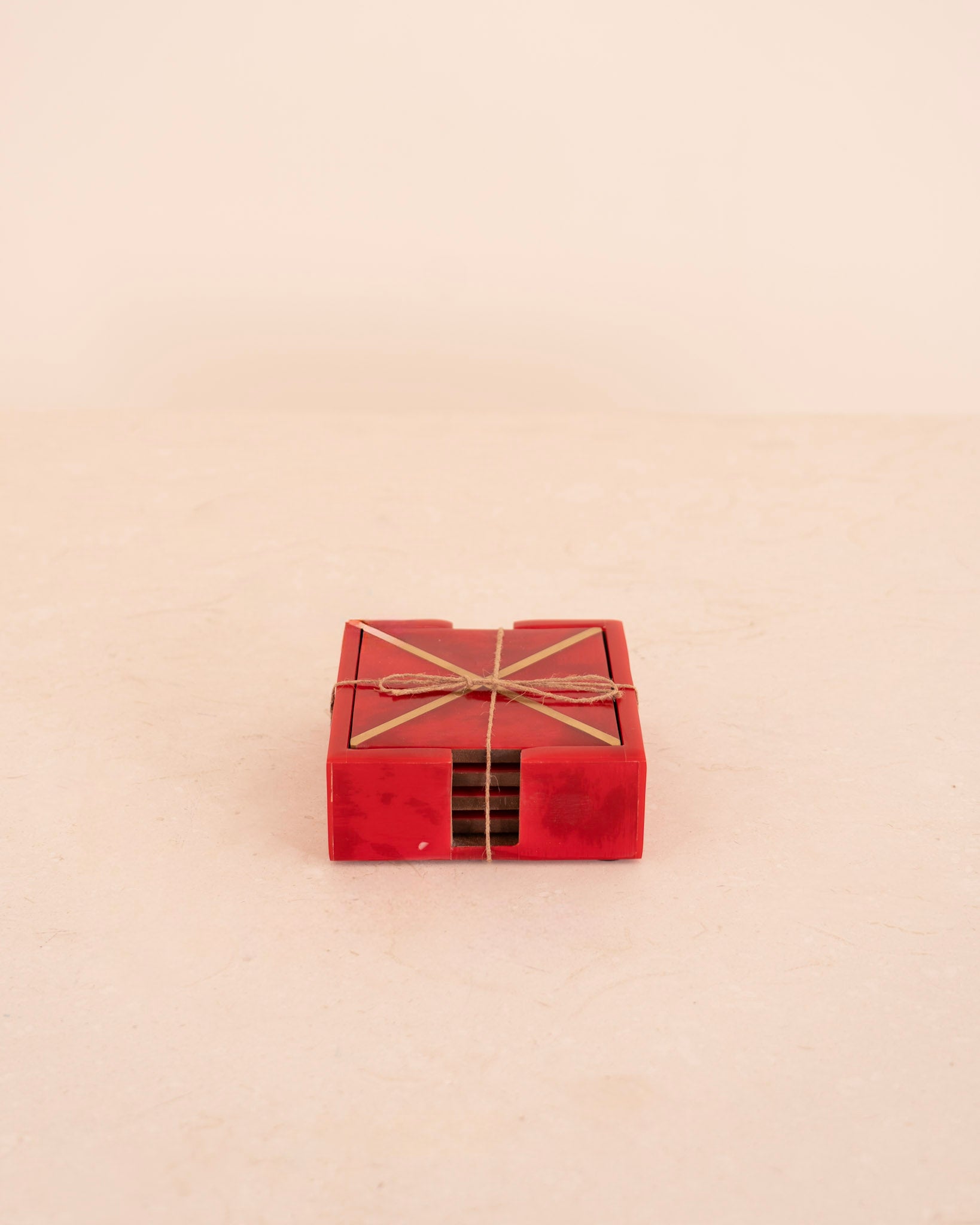 Precioso set de posavasos fabricados en madera lacada en color rojo y con detalle en latón dorado. Cuenta con caja de madera sin tapa para guardar.