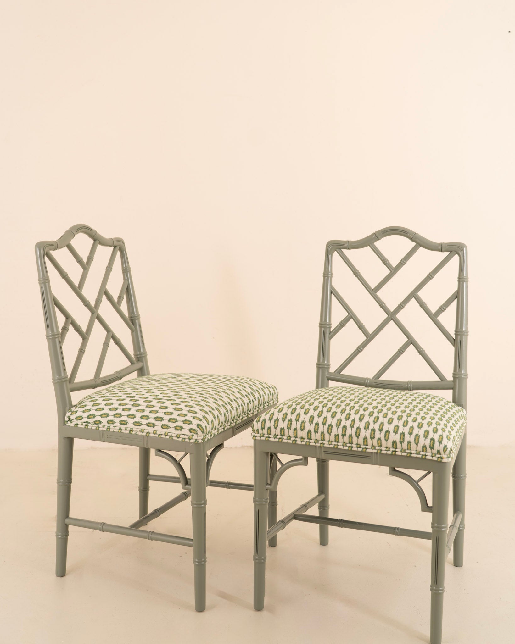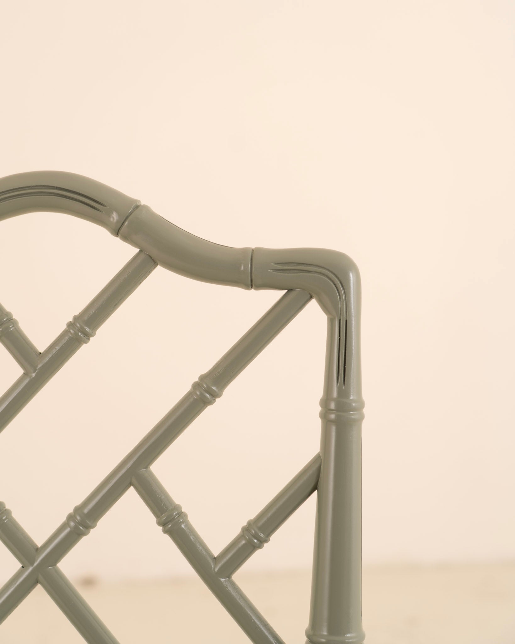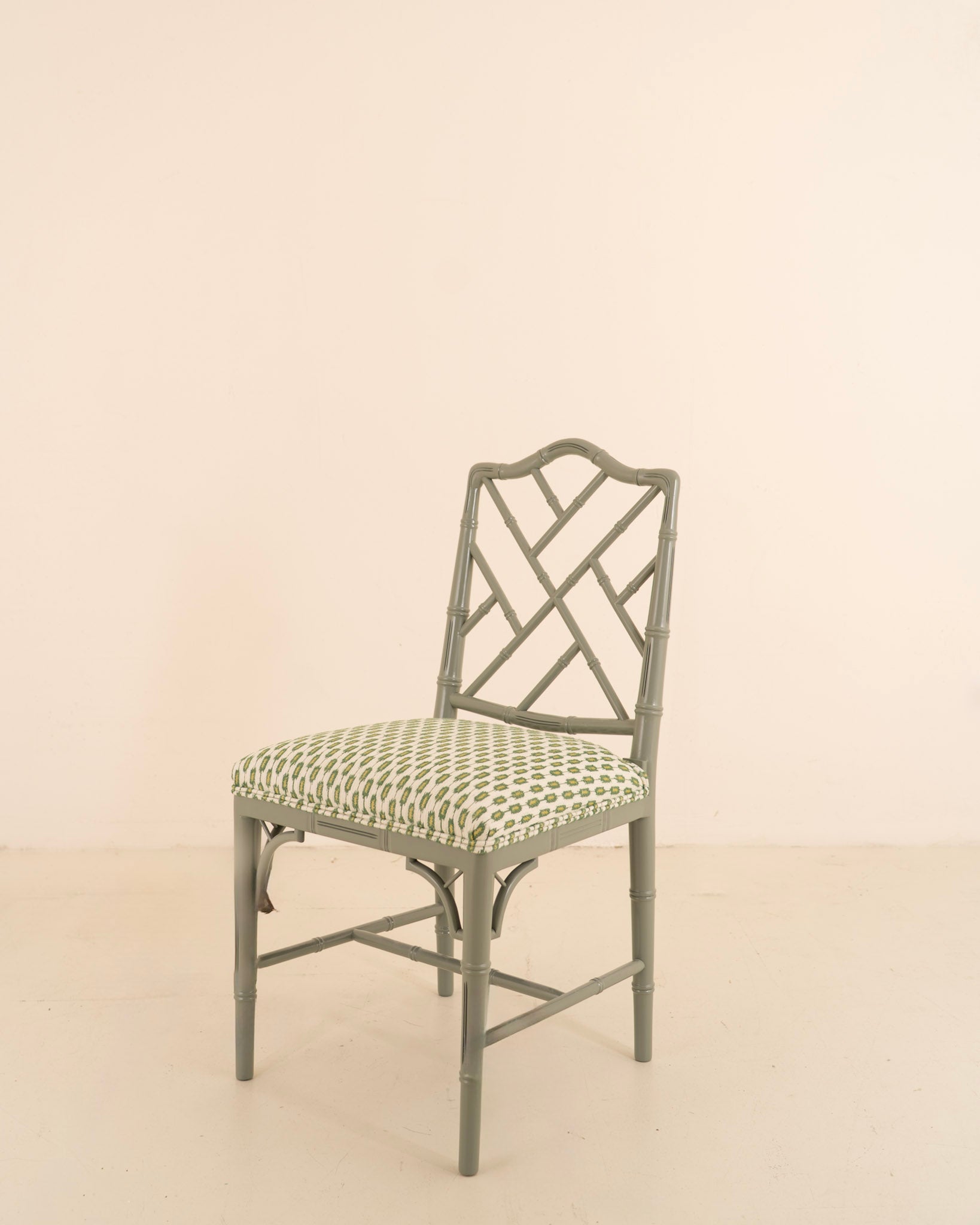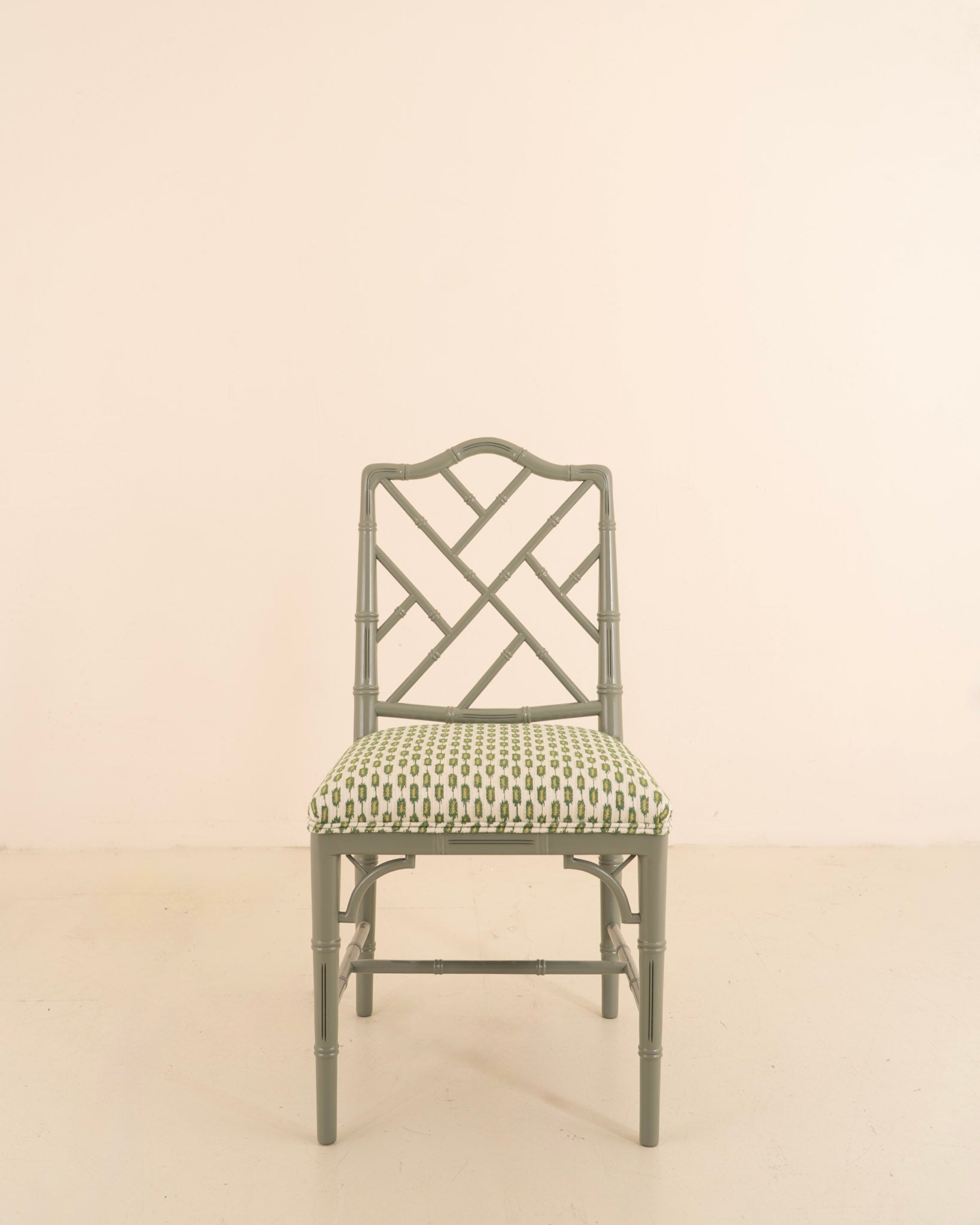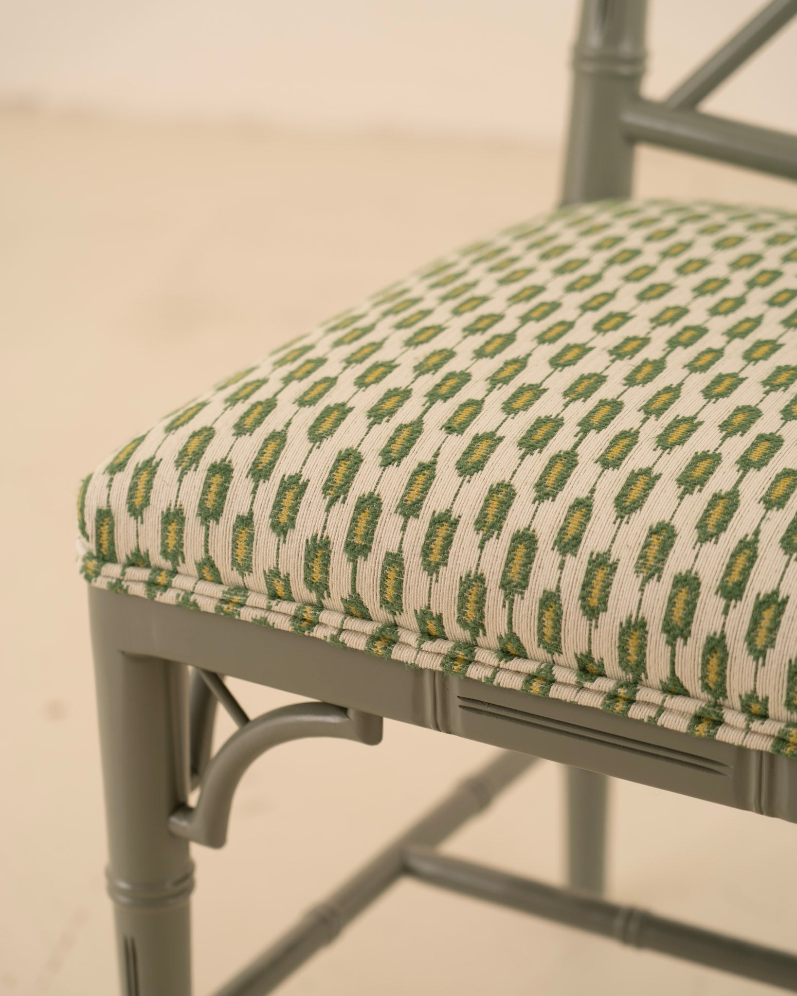 Estructura en madera natural acabada en verde grisáceo y asiento tapizado en tela lavable verde, blanco y azul.