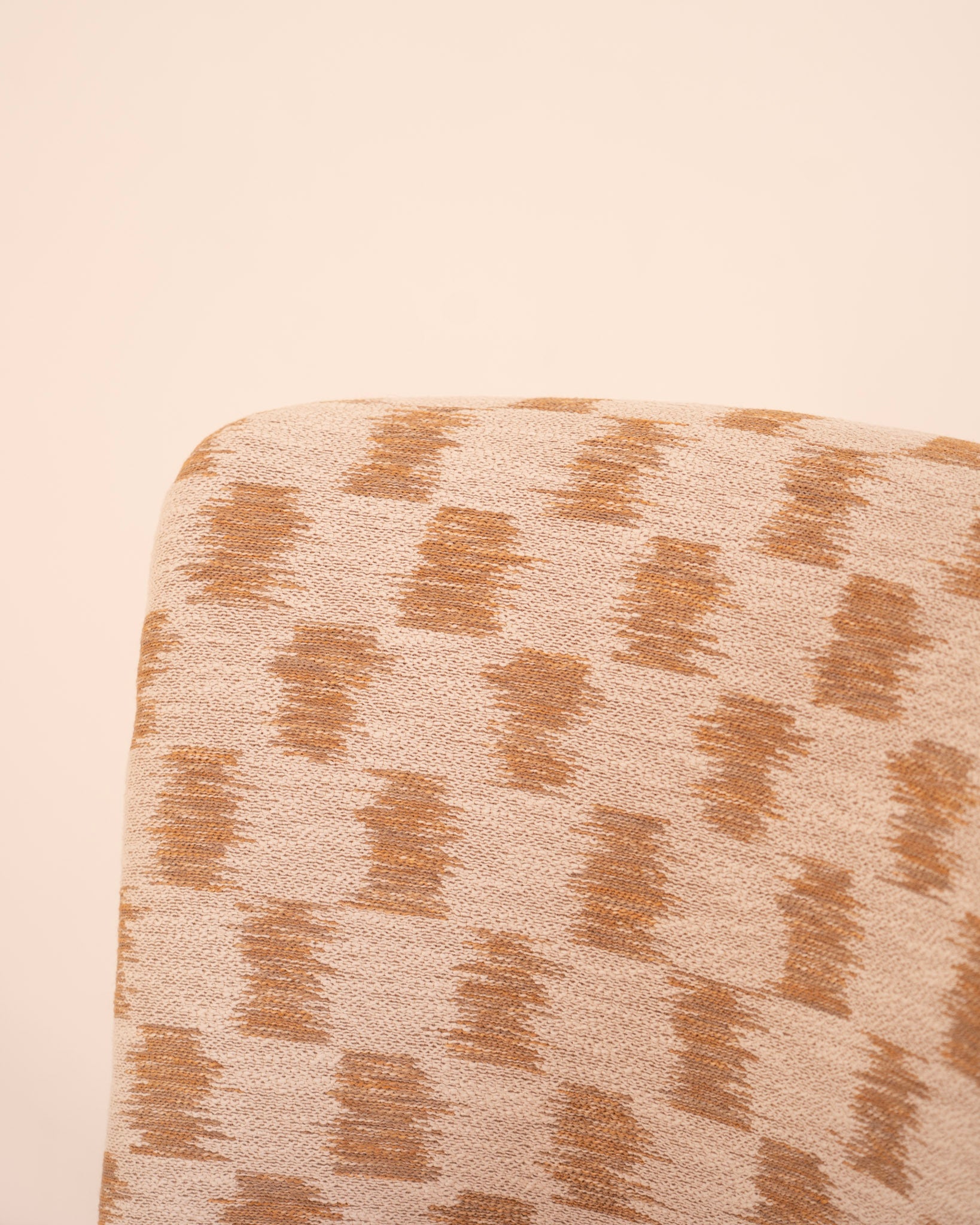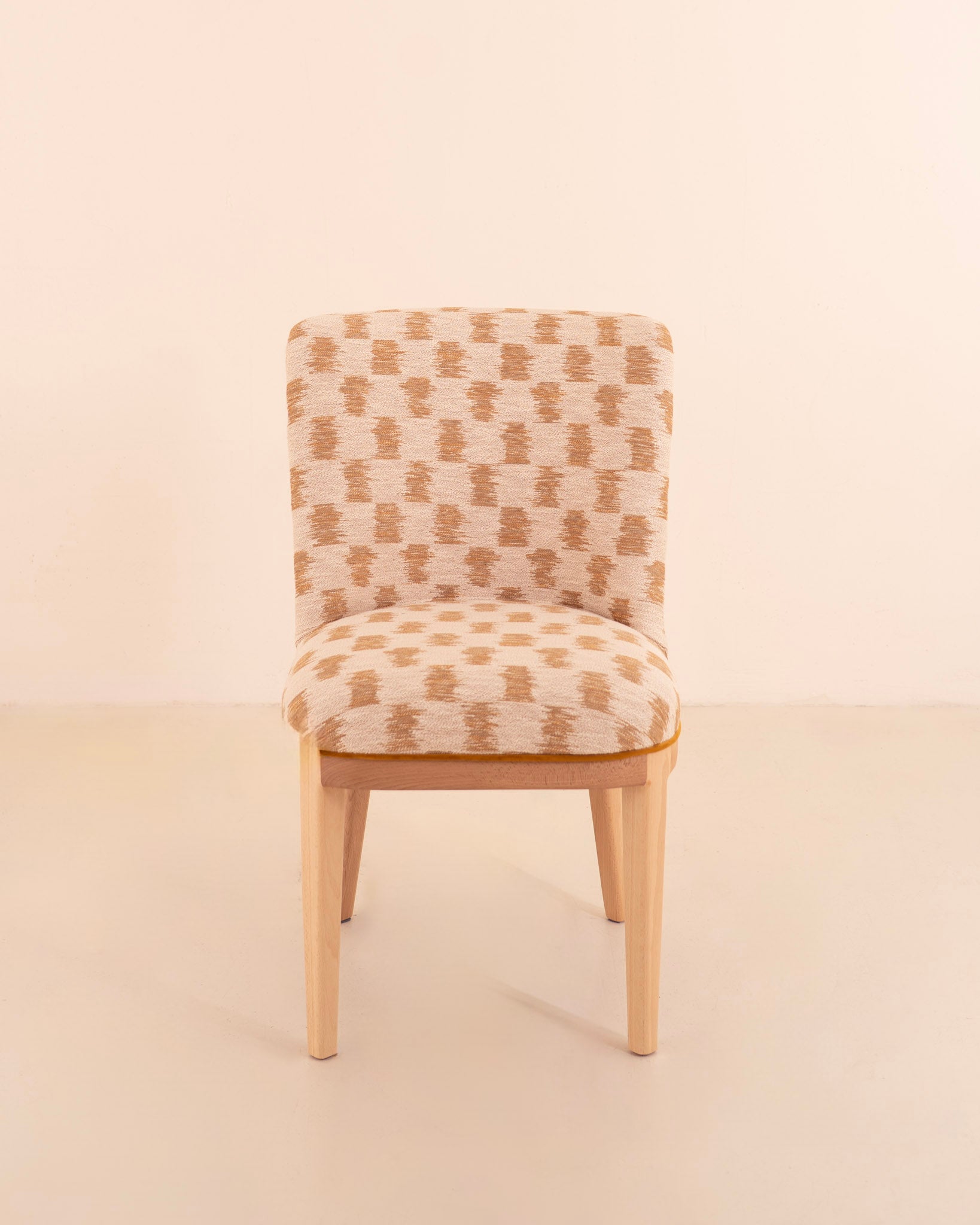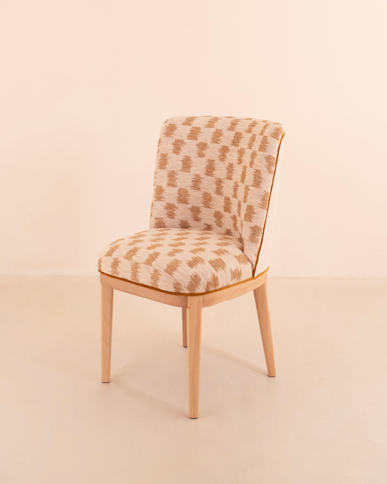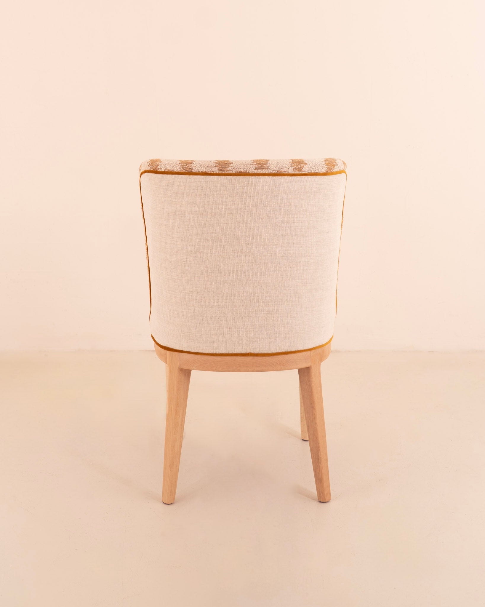 Silla de diseño clásico renovado con la combinación de telas atemporales en tonos beige y mostaza.