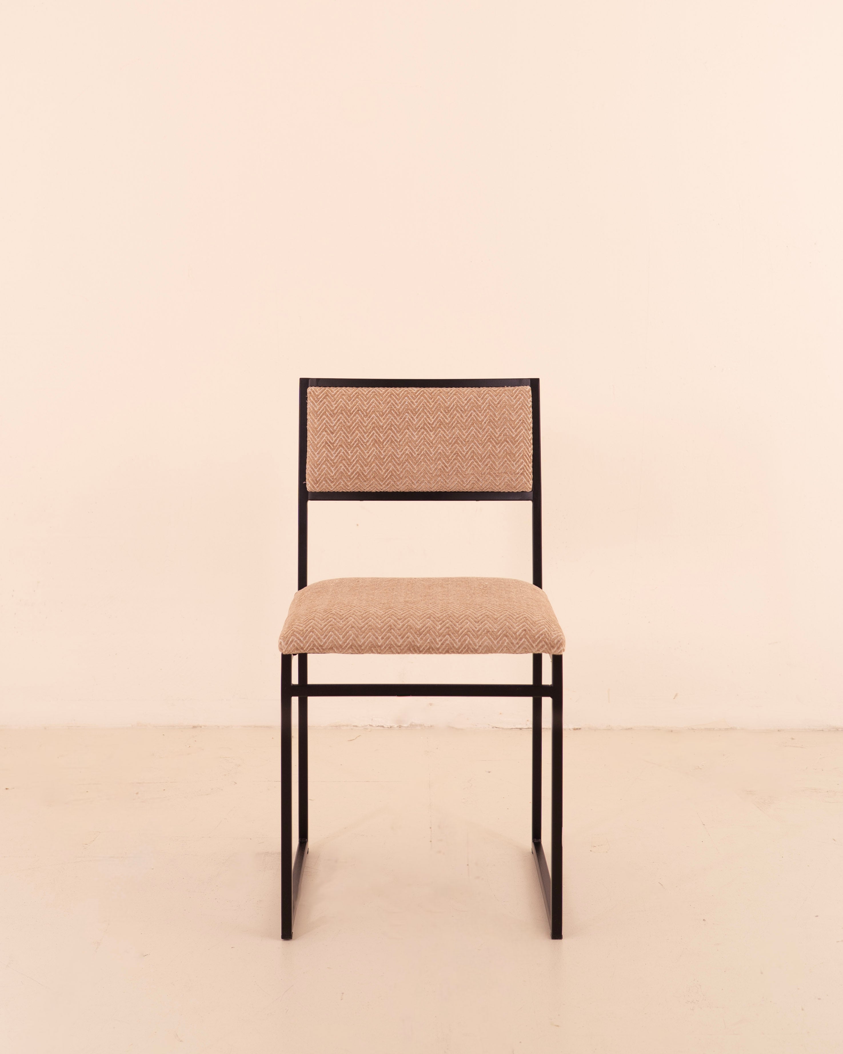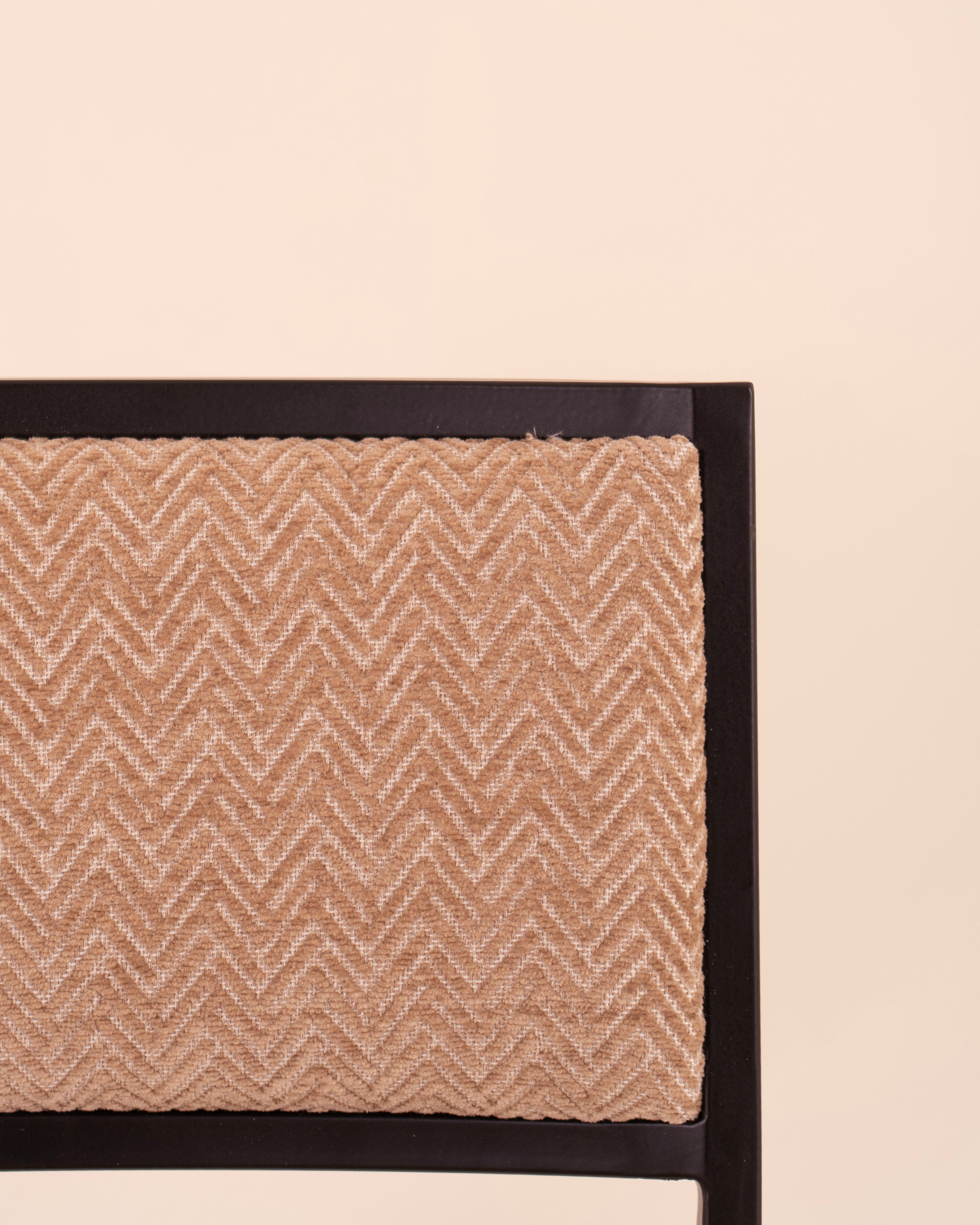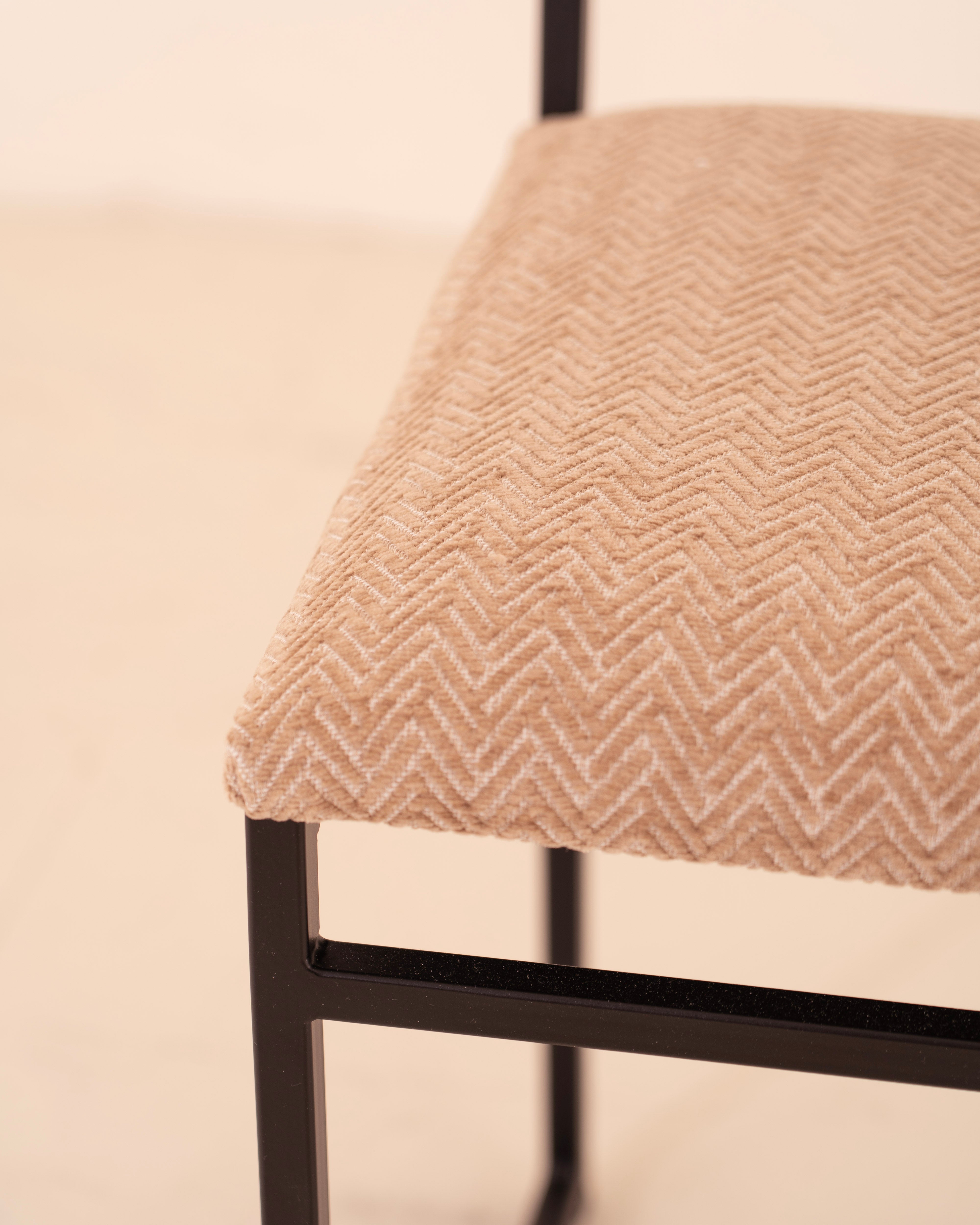 Silla con estructura en hierro negro asiento en tetal aqua clean en color blanco y con dbujo geométrico en tono moca.