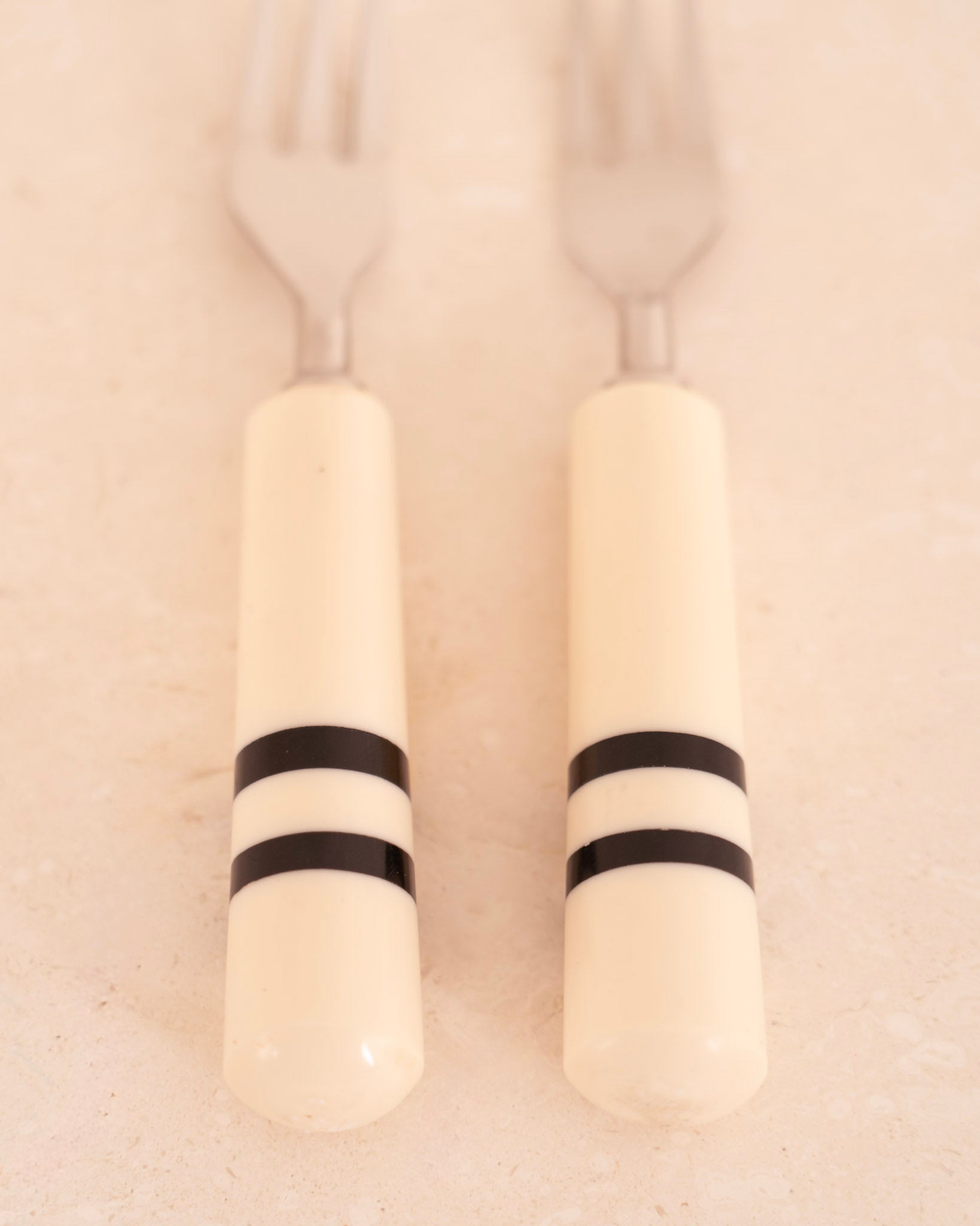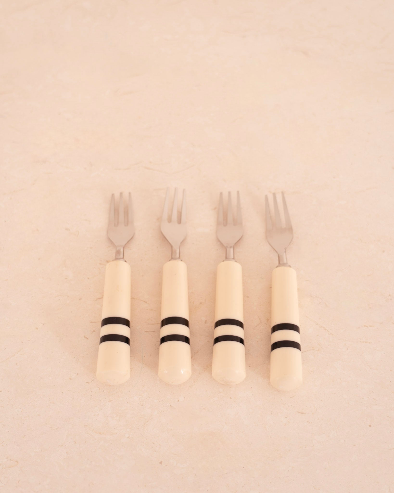 Tenedores para aperitivos con mango de madera acabada en blanco y negro.